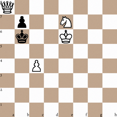 Now, here we have a 'KQNP vs kp' mate in two chess puzzle or problem (whichever you wish to call it) composed by the program, Chesthetica, using the Digital Synaptic Neural Substrate AI computational creativity method. Chesthetica is able to generate a variety of compositions using any combination of pieces. Read more about it here.