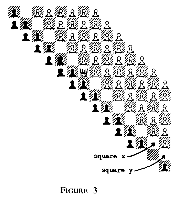 A queen on square x or y checkmates. White will need at least four moves to avoid checkmate in this situation (by moving his pawns up, or escaping on the diagonal.) So, the construction must ensure that Black must be able to get a queen to x or y in time if White attempts to escape, and that the winner of the game gets a queen free that can move to x or y. (Black’s king is trapped in a similar wall of pawns.)
