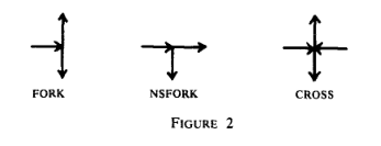 First he shows that Generalized Geography, played on an arbitrary graph, can be reduced to playing on a grid graph, yielding the PSPACE-complete game “Array Generalized Geography” or AGG. Then that is reduced to “Nonstandard AGG” in which the graph contains only the following sorts of nodes (plus the start node and dead-end nodes) in the orientations shown: