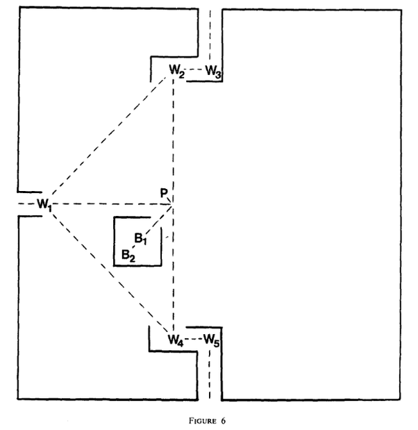 The other widgets are given schematically rather than piece by piece. The lines are walls of pawns at least two thick; W represents a White queen; P represents a Black pawn, and B represents a Black queen. Here is the widget representing the “fork” node shown above: