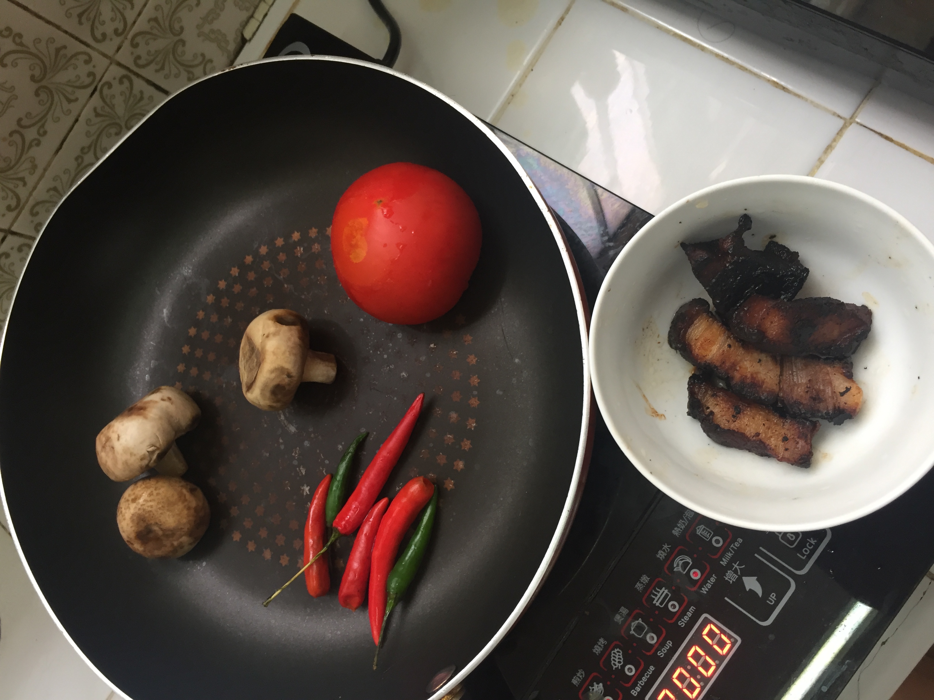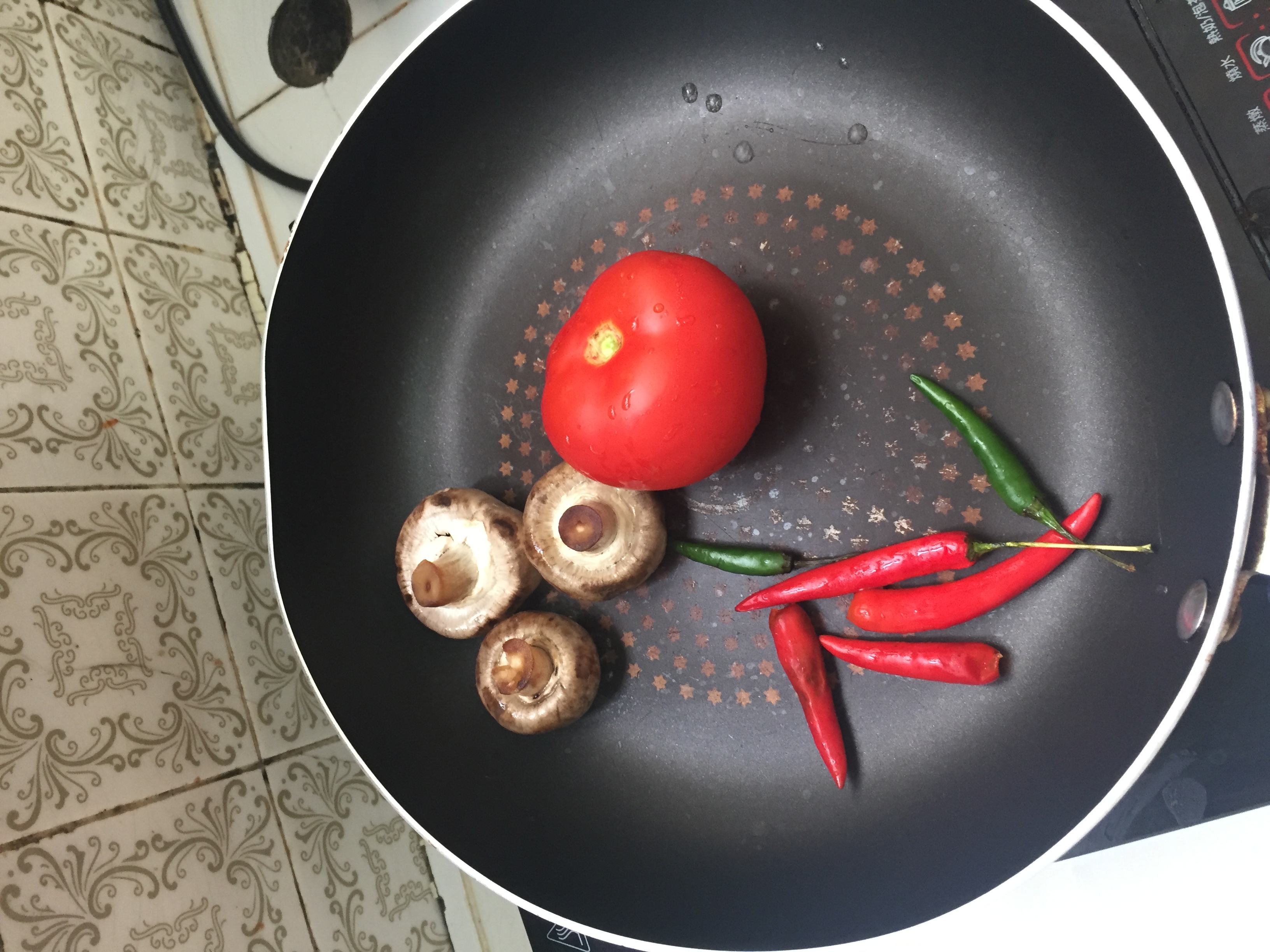 A tomato, some chilis, some mushrooms, some shop fried, and of course rice... this is my simple cooking of the day.