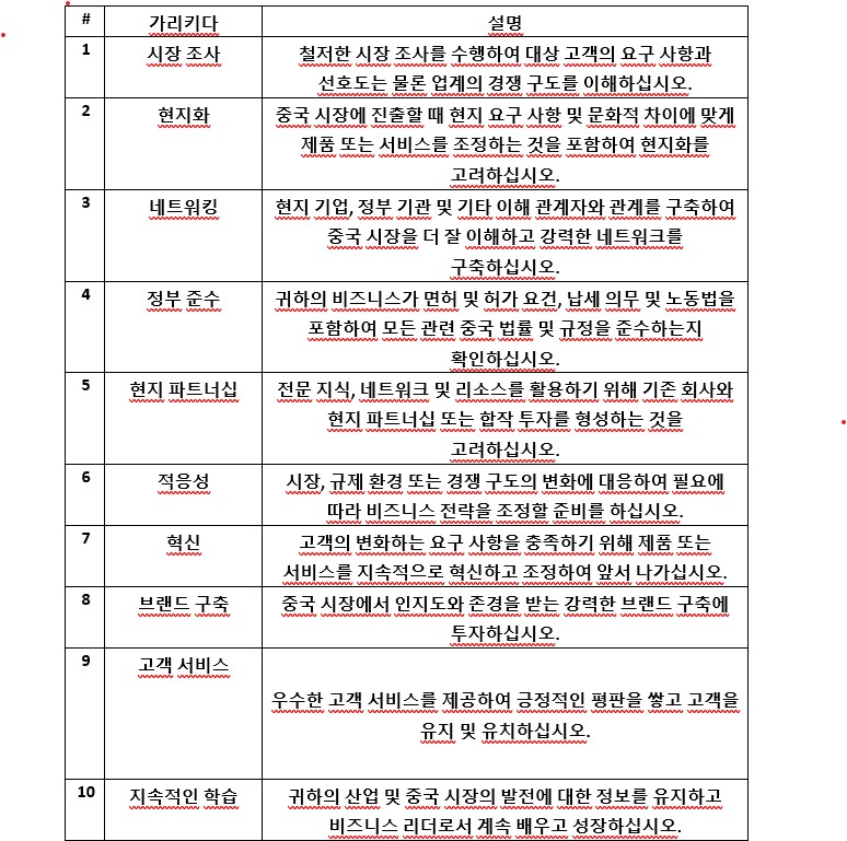 다음은 중국 비즈니스 분야의 성공을 위한 10가지 포인트가 있는 표입니다.