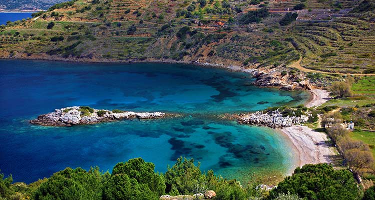 Trahili is an exotic bay with crystal waters 20 km west of the town of Chios and 5 km north of Lithi. It is an isolated pure cove far from the crowded beaches offering the surrounding area a natural beauty.