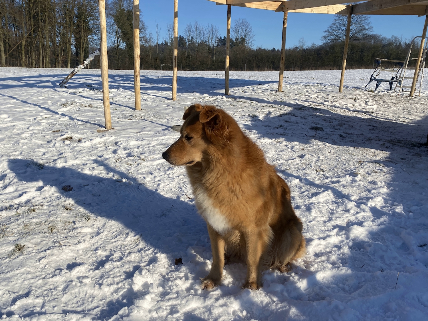 Nö, Mäx hatte viel Spaß. Er lässt den Blick über seine Liegenschaften schweifen, hofft vielleicht, dass der nächtliche Besucher, von dem er bereits drei Schleichwege untern den Zaun hindurch entdeckt hat, sich auch mal tagsüber blicken lässt: Der Dachs! Okay, vielleicht friert er auch etwas, tobt ja niemand mit ihm... ;-D