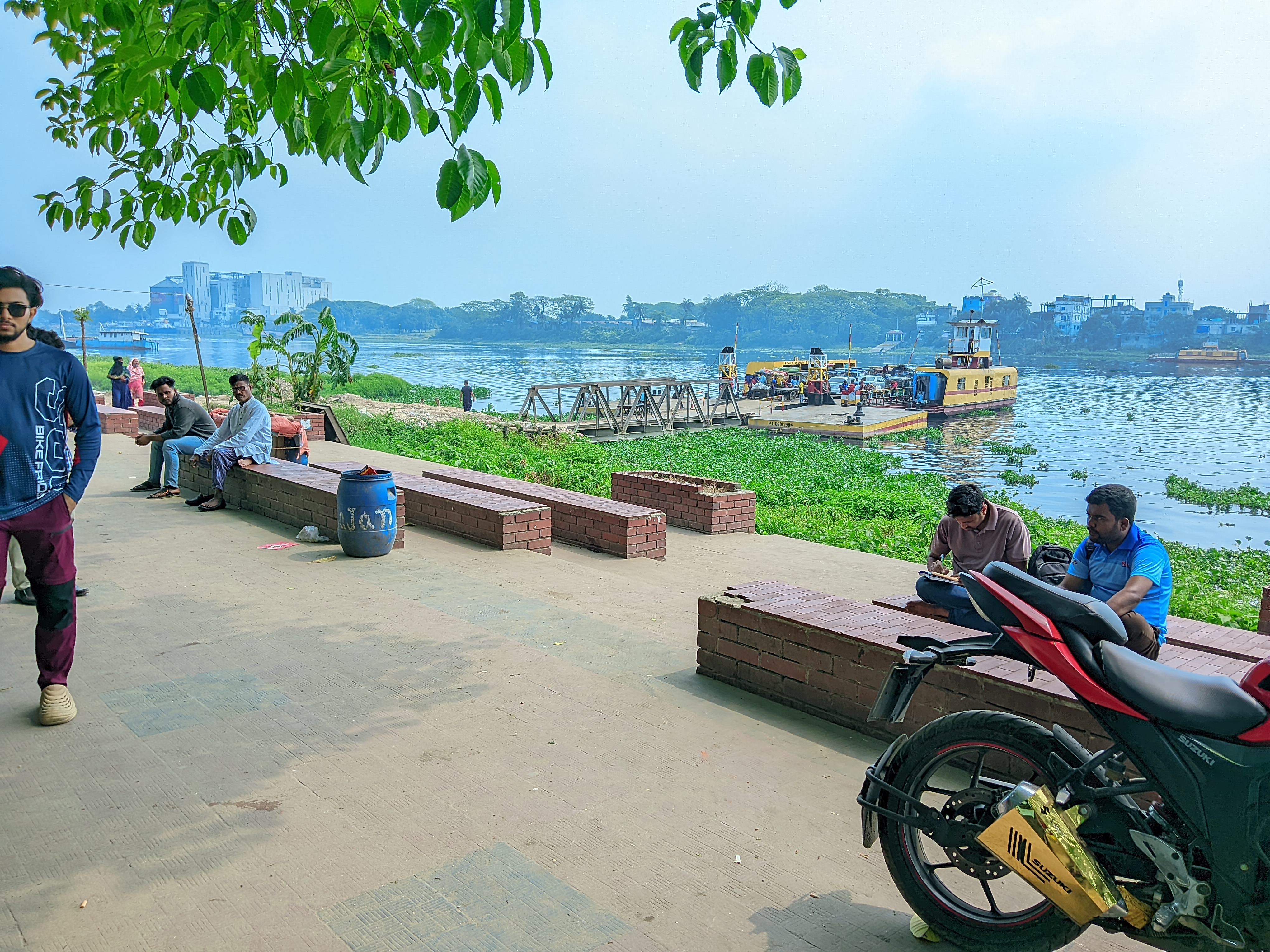 The environment of the ferry terminal is very busy; the flow of passengers starts at this ferry terminal from early morning. Some are going to work, some are returning to their villages, and some are crossing the river with goods for business purposes. If you stand at the ghat, you can see buses, trucks, private cars, and motorcycles waiting in a row to board the ferry. There is a beautiful seating arrangement here where you can sit and wait for the ferry. These seating areas are provided by the government, and the open seating area at the ferry terminal on the river is very beautiful.
