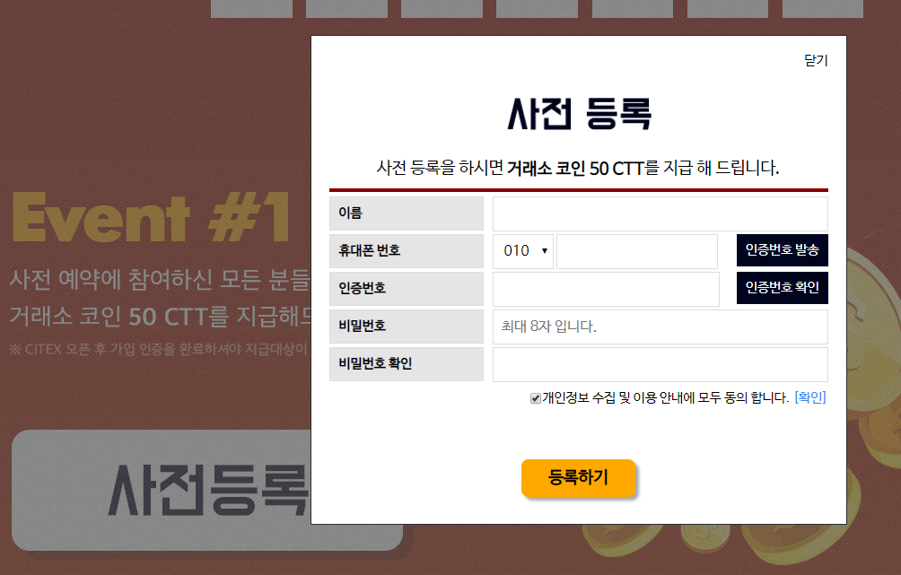 아래와 같이 사이트에서 사전등록 클릭후 핸드폰인증만하면됩니다..!!