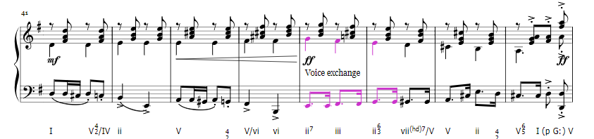 This A section repeats and is followed by the B section in D major. I will now mention that this is one of the coolest themes in the entire nutcracker. I am in love with it! I am quite fond of themes which utilize bass instruments like this theme uses the bass instruments. It is just so incredible. This section also consists of an antecedent unit which lands on V7 and consequent unit which lands on I (which pivots to become V of G).