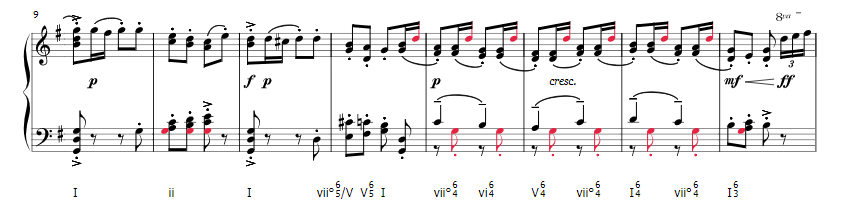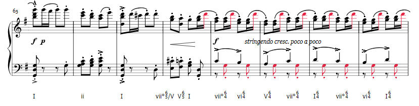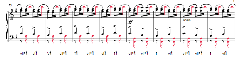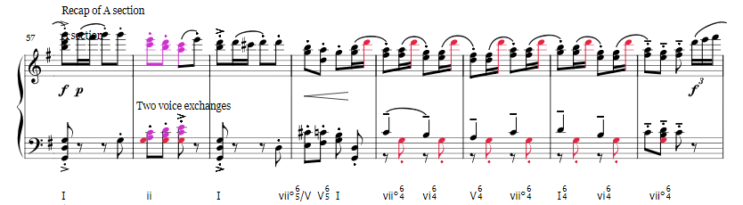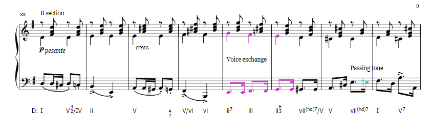 The harmonics of this piece are actually quite interesting. I often find myself confused by Tchaikovsky's harmonic decisions. They sound good, but sometimes it seems weird (to my feeble mind). One thing I am quite fond of is his use of something similar to Fauxbourdon which is a use of parallel first inversion chords. Tchaikovsky utilizes, within the last four measures of the A theme, parallel 2nd inversion chords (over a pedal point G, and under a pedal point D). I found this quite interesting. I labeled the pedal points with maroon.