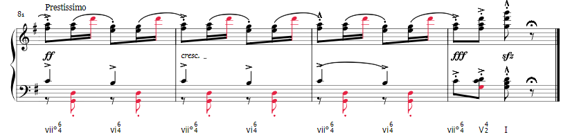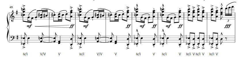 If this piece is about anything, it is about rhythm. The 8th note two sixteenth note figure is prominent throughout the piece, and the whole piece is incredibly designed in how it uses rhythm to perpetuate excitement and exhilaration in the audience.