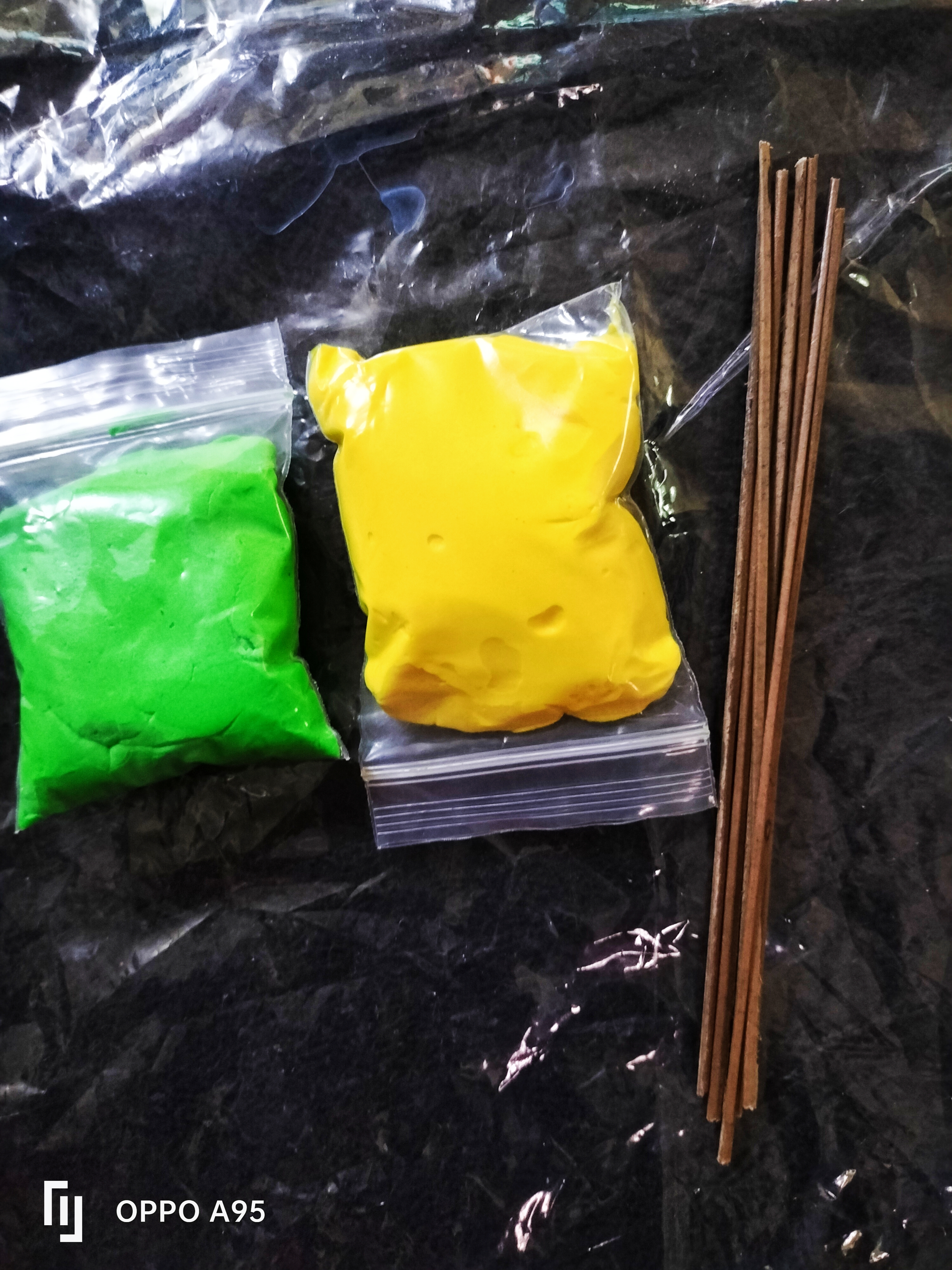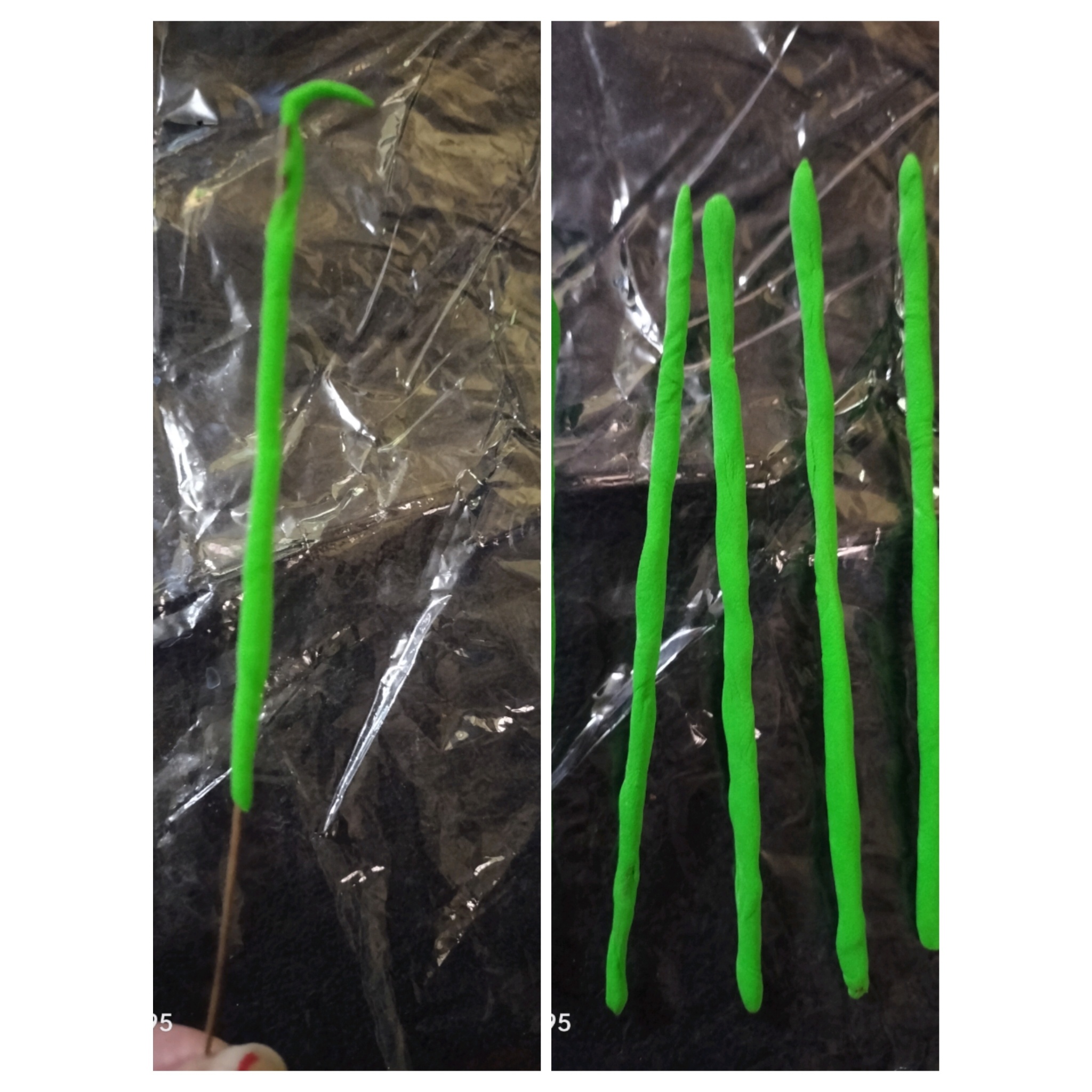 প্রথমে আমি সরিষা ফুলের ডাল বানানো আর সেজন্যই কিছু চিকন কাঠি নিয়েছি এবং সবুজ কালারের ক্লে দিয়ে তা মুড়িয়ে নিয়েছি। মোড়ানো কাঠি গুলো একটি পলিথিনের উপরে রেখেছি কারণ তাতে করে ক্লে আটকে যাবে না।
