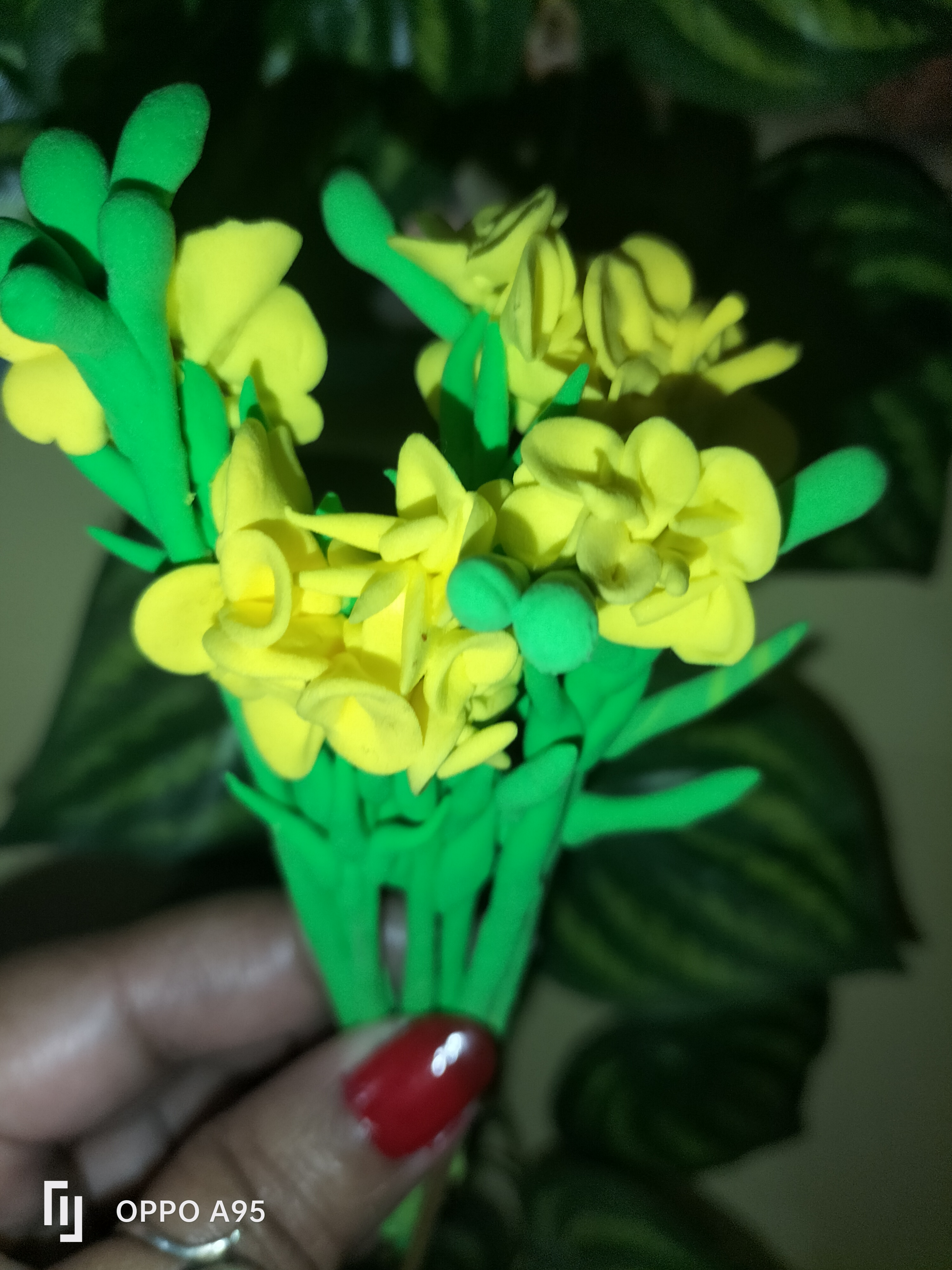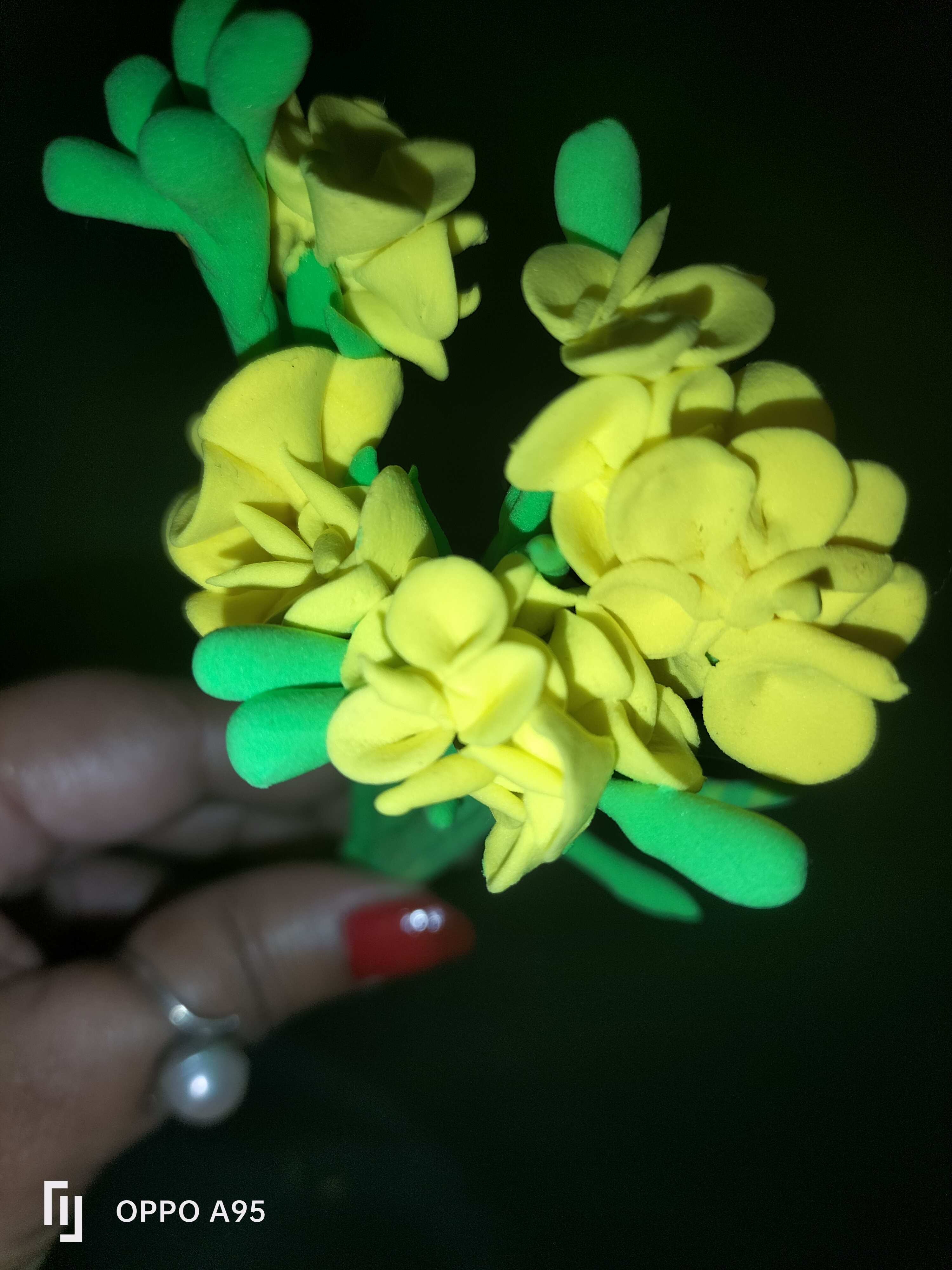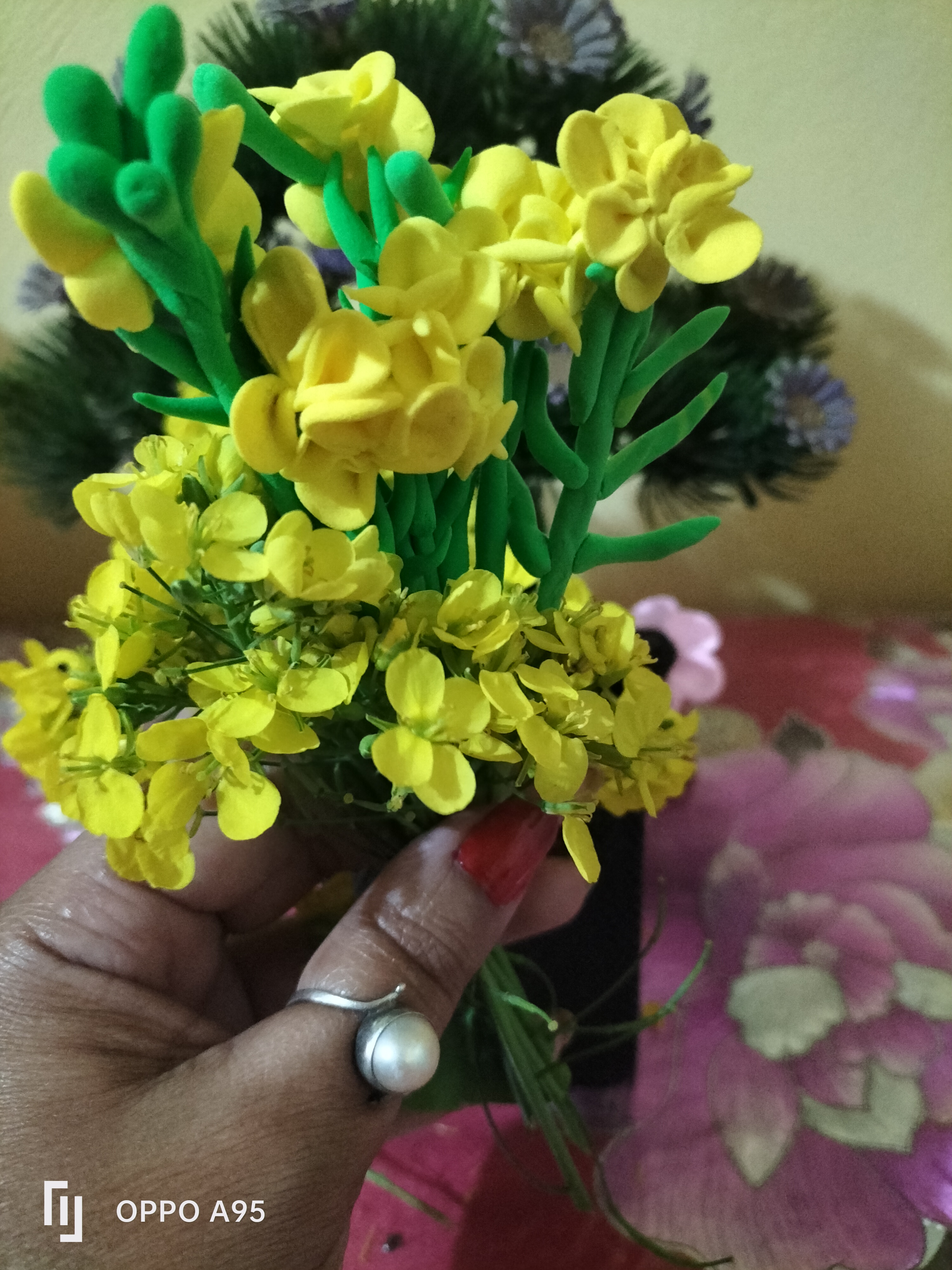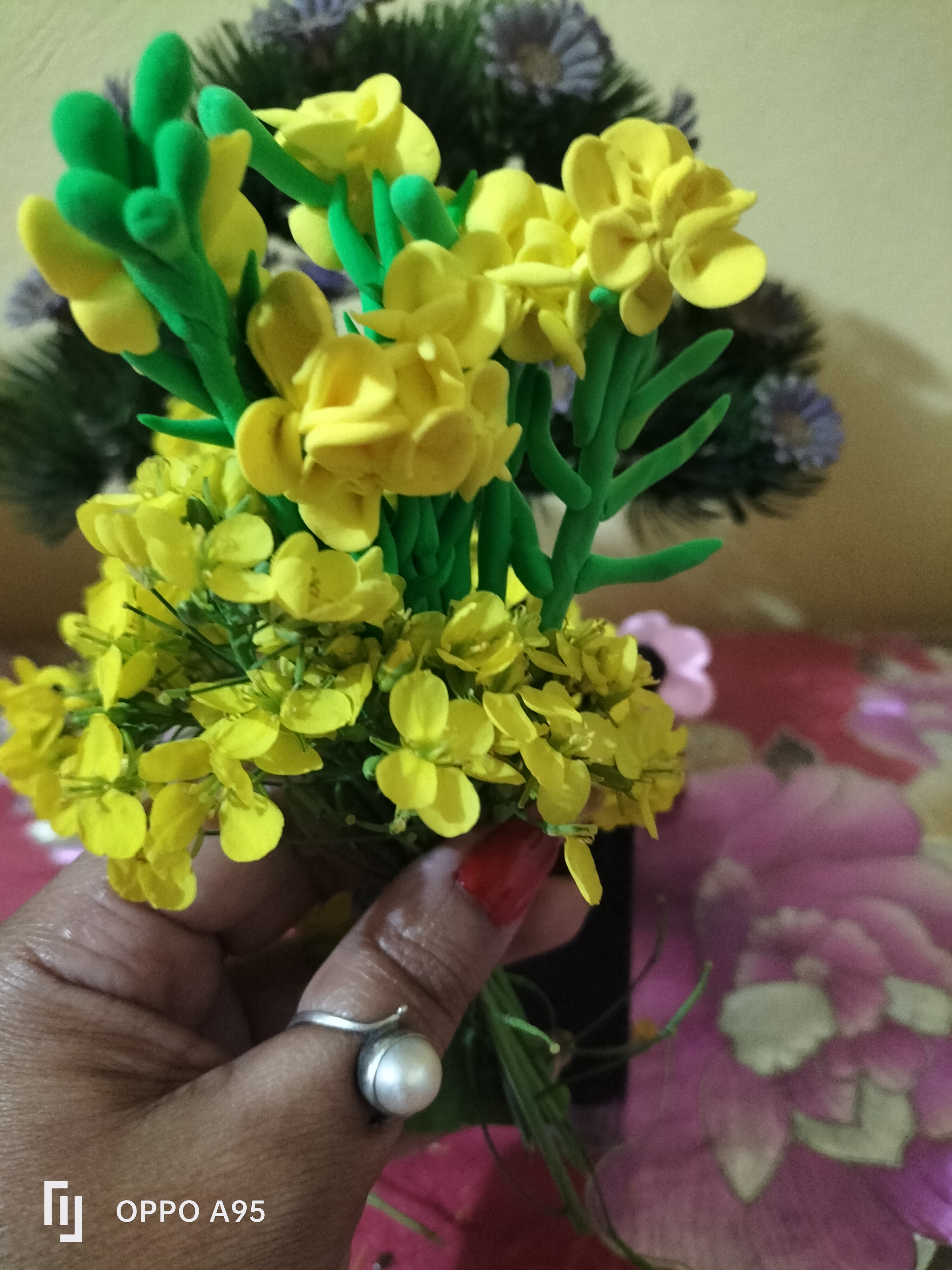 যে কথা সেই কাজ সবুজ ও হলুদ ক্লে নিয়ে বসে পড়লাম সকালে চা মুড়ি খেয়ে।ভেবেছিলাম অল্প সময়েই তো হয়ে যাবে কিন্তুু না আমার ধারণা মোটেই ঠিক নয় সরিষা ফুল খুব সুন্দর করে বানিয়েছি ঠিকই কিন্তুু সময় লেগেছে অনেক।আসলে ক্লে দিয়ে কিন্তু বানানো সহজ মনে হলেও ততটা সহজ নয়। বেশ সময় লেগেছে সরিষা ফুল বানাতে।অনেক ধৈর্যের প্রয়োজন।