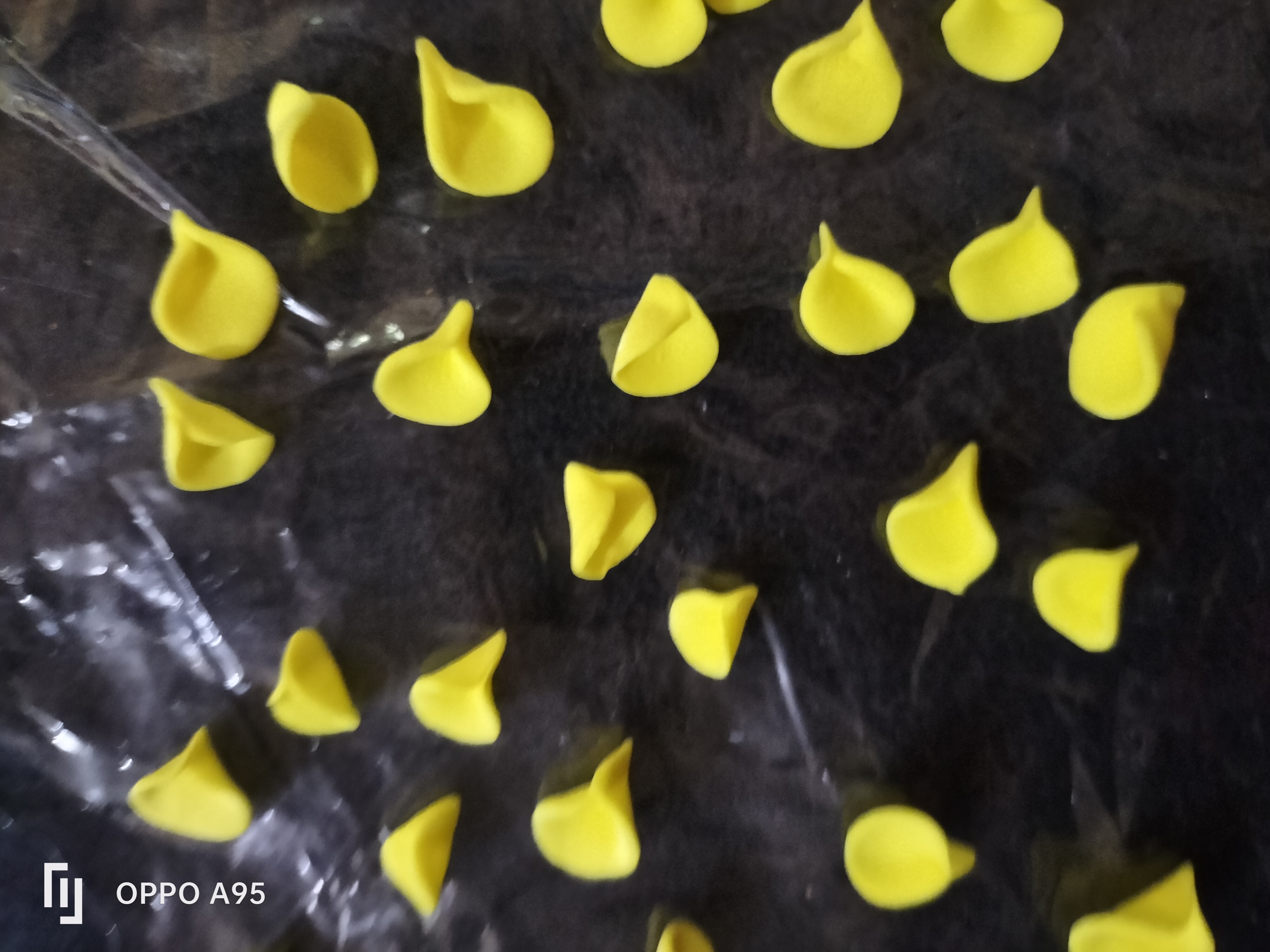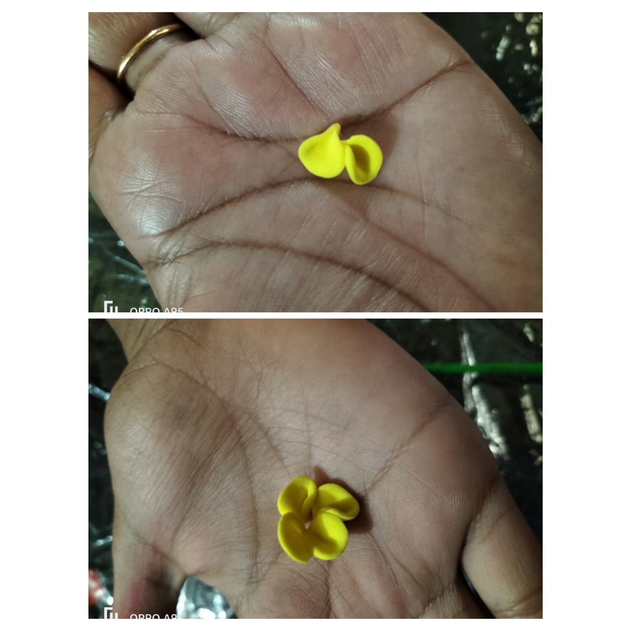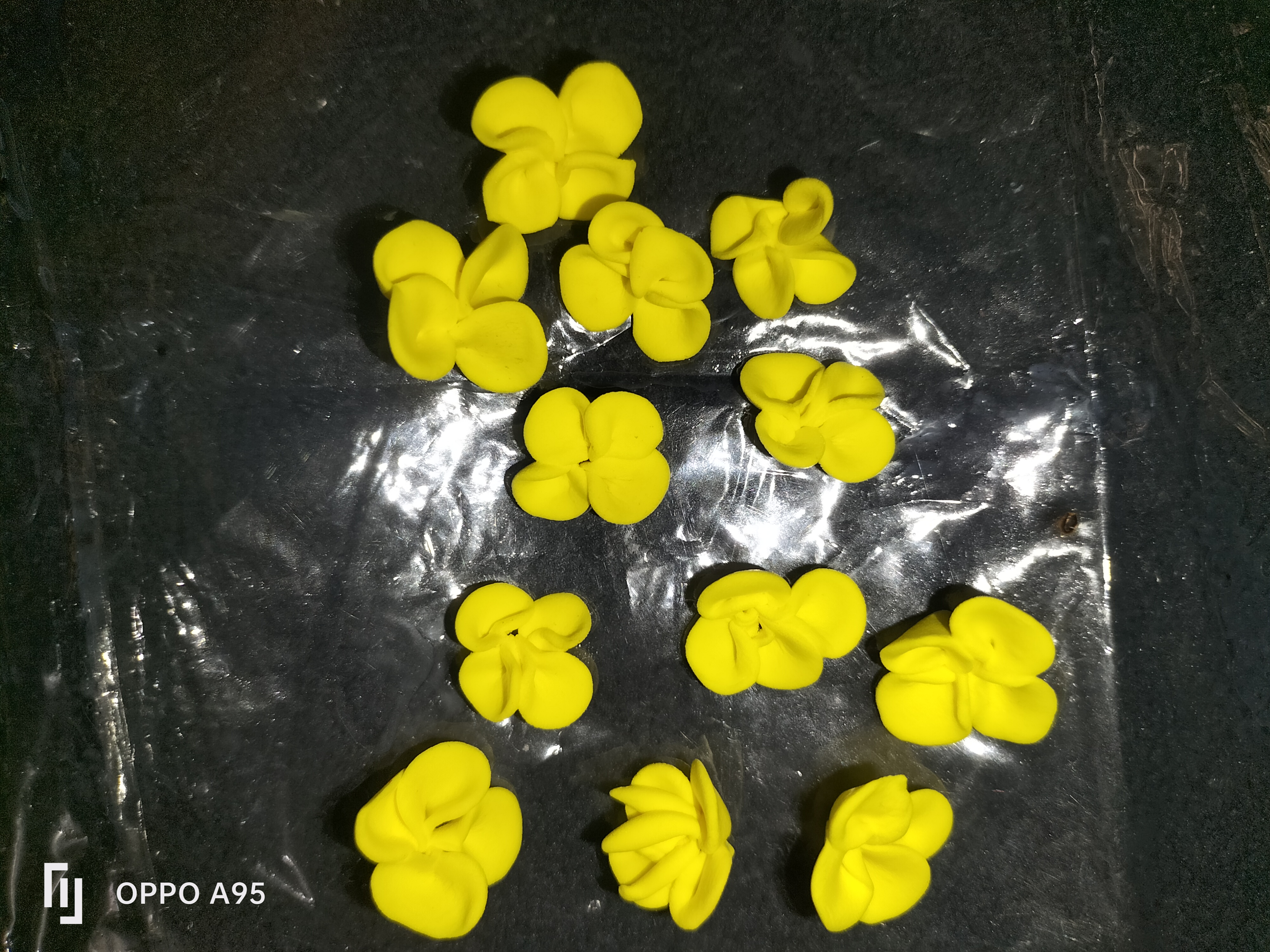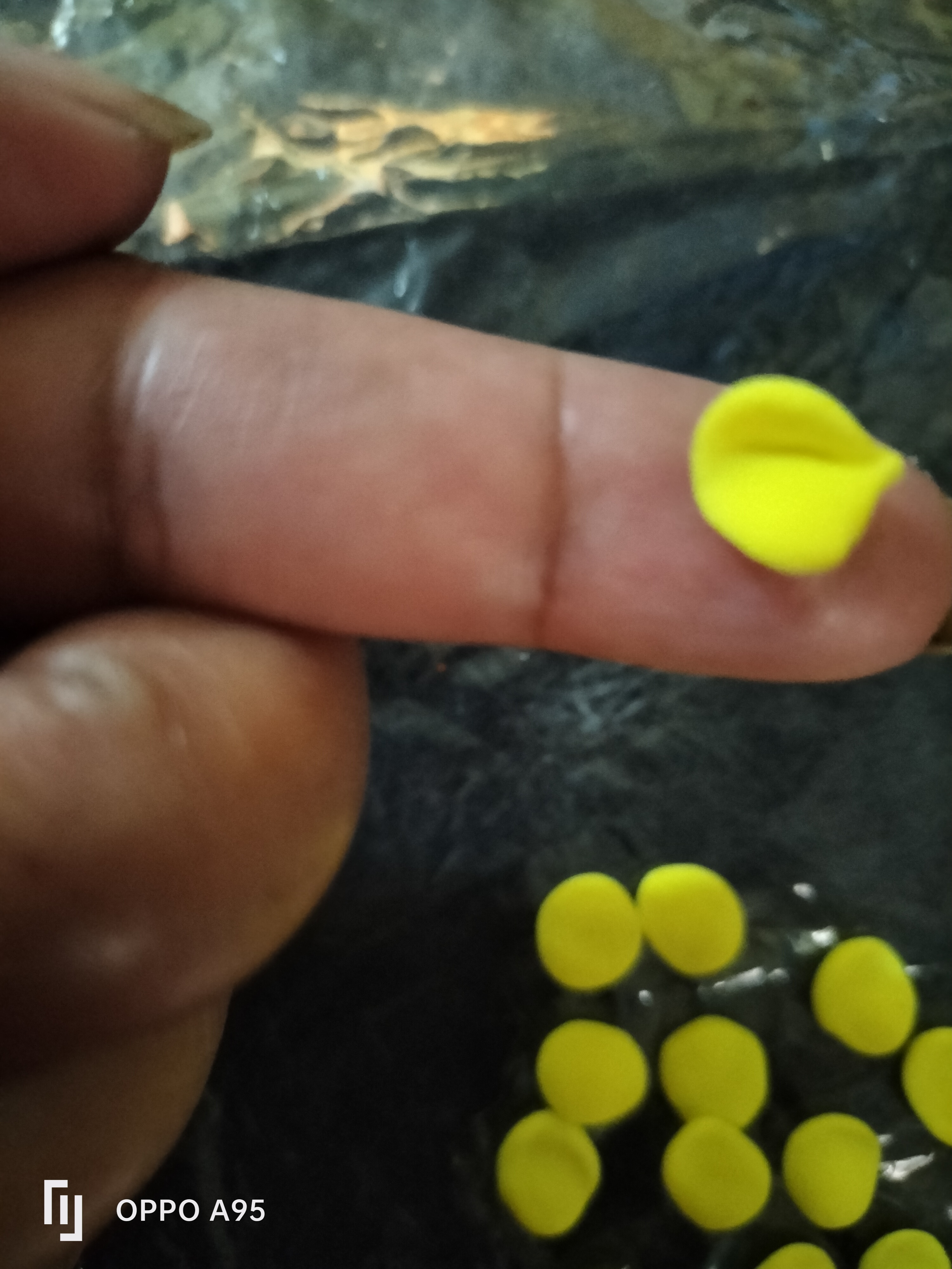 এখন হলুদ কালারের ক্লে দিয়ে সরিষা ফুলের পাঁপড়ি বানানোর জন্য গোল করে তা চাপ দিয়ে চ্যাটটা করে পাপড়ি বানিয়েছি। একে একে সব গুলো পাপড়ি বানিয়ে রেখেছি।