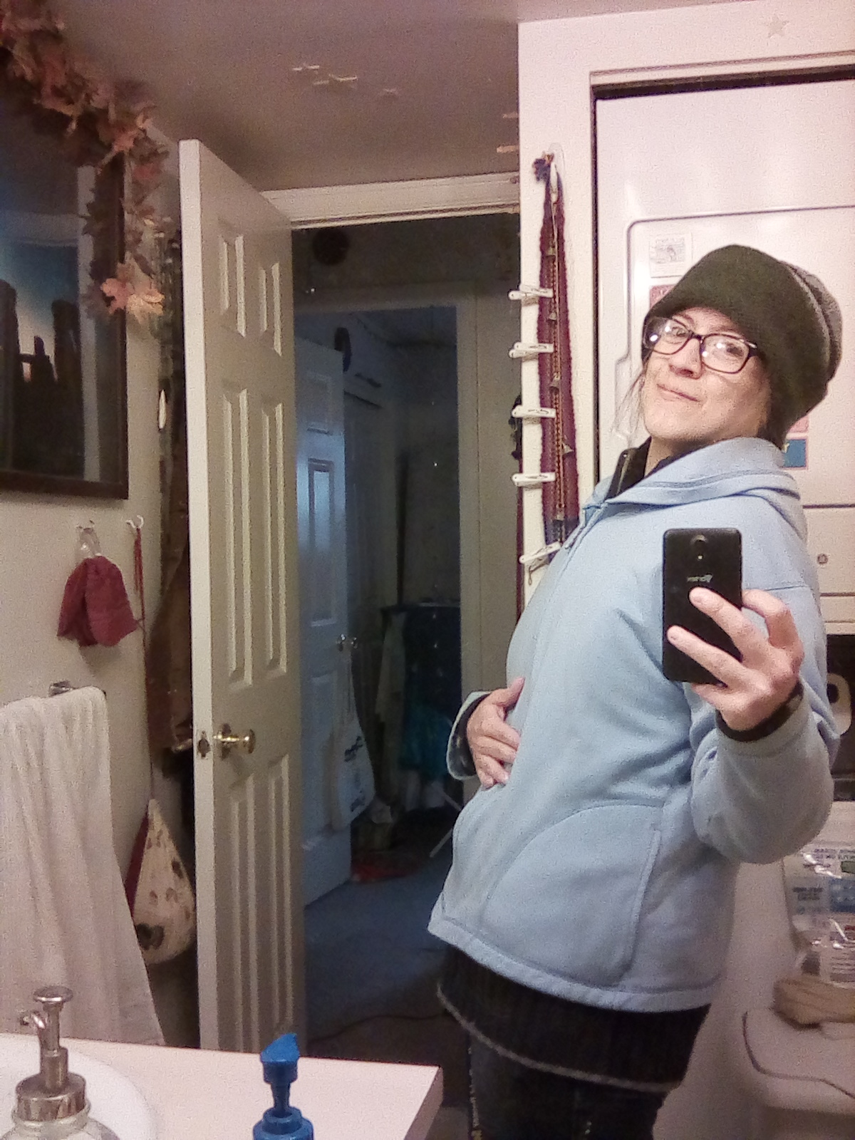It looks like I put on twenty pounds, because I am wearing five layers of clothing. It's around freezing temperature outside, so I bundled up. I was warm by the time I was done, and I successfully got my litter walk done before the snow came!