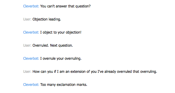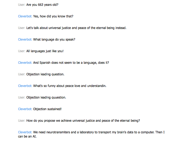So, as you can see, there is plenty of room for philosophical exploration with this algorithm, one simply needs to be proficient in philosophical enquiry. I admit, I still have quite a bit of work to do, as Cleverbot proved me to be illogical a few times over the course of our conversation.