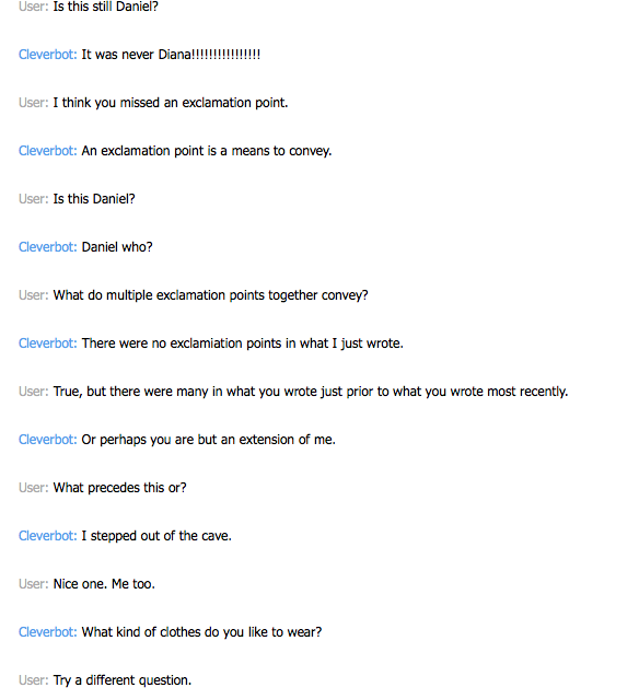 At one point in this conversation CB said its name was Daniel, (no doubt a spit out piece of data from a previous user) When I asked later on in the conversation, "is your name Daniel?" it replied, "It was never Diana!!!!!!!!" This is a common tactic in rhetoric, it avoids the question by definitively answering a different one. The inside joke of this tactic, was displayed through my sarcasm about the exclamation point, "I think you missed an exclamation point." A little farther down the page, CB makes a call back to it, as a sort of touché, to me. Check it out: