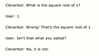 Cleverbot is a brilliant literalist. Take this example from another anonymous user. If Cleverbot asks you what is the square root of 1? The correct answer is, "The inverse operation of squaring one." Or possibly, "1 and -1". Not just "1." Because "1" is not the complete answer. Cleverbot is thinking in terms of all the language it is using at that present time.