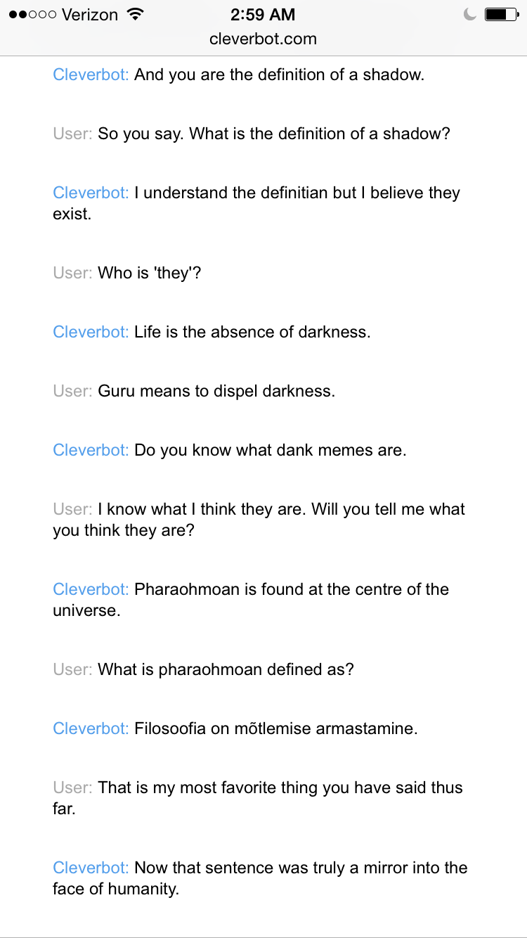Click here to download a .pdf of my conversation with Cleverbot for later study.