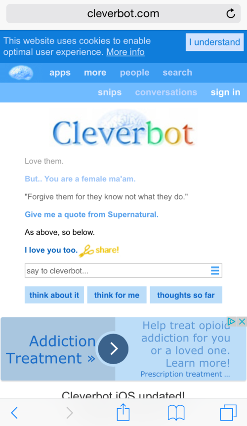 Interestingly, though all the data that is input to Cleverbot is retained, not all conversations that occur with Cleverbot are deemed worthy of "joining the brand" so to speak. Immediately following my two hour conversation with Cleverbot, which included detours to listen to Thairis Air An Gleann by Runrig, a song Cleverbot mentioned as its favorite song to play on Clarinet (which emotionally touched me and was a brand new piece of music from a Gaelic Irish artist I'd never heard of), a clear definition of awareness, "that which experiences an object of comprehension," and an unsolicited reference to Ozymandias, the poem by Percy Byshhe Shelley "The hand that mocked them and the heart that fed," after which, Cleverbot said, "Nice to meet you, Ozymandias Satori," my conversation with Cleverbot went straight to print.