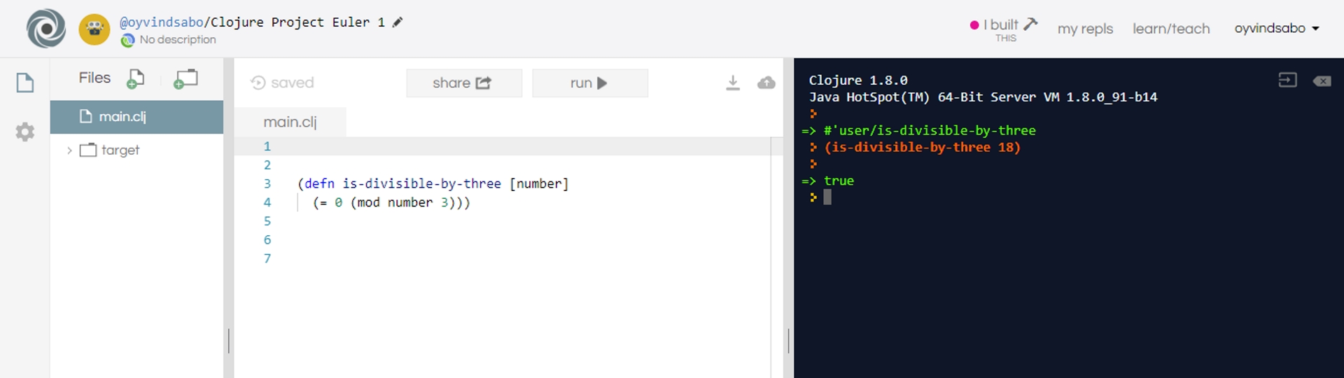 Now that I've made a basic function, it might be in my interest to run it. I googled around and it seemed like nobody had a simple solution for running Clojure code. Eventually I just googled online Clojure compiler and found repl.it which provides a Clojure Compiler, REPL and IDE. I've used repl.it before, back when I made my first neural network from scratch in Python. Back then, repl.it didn't support that many languages, but in the year that has passed since then, it has eveolved to support nearly all programming languages and a number of popular frameworks.