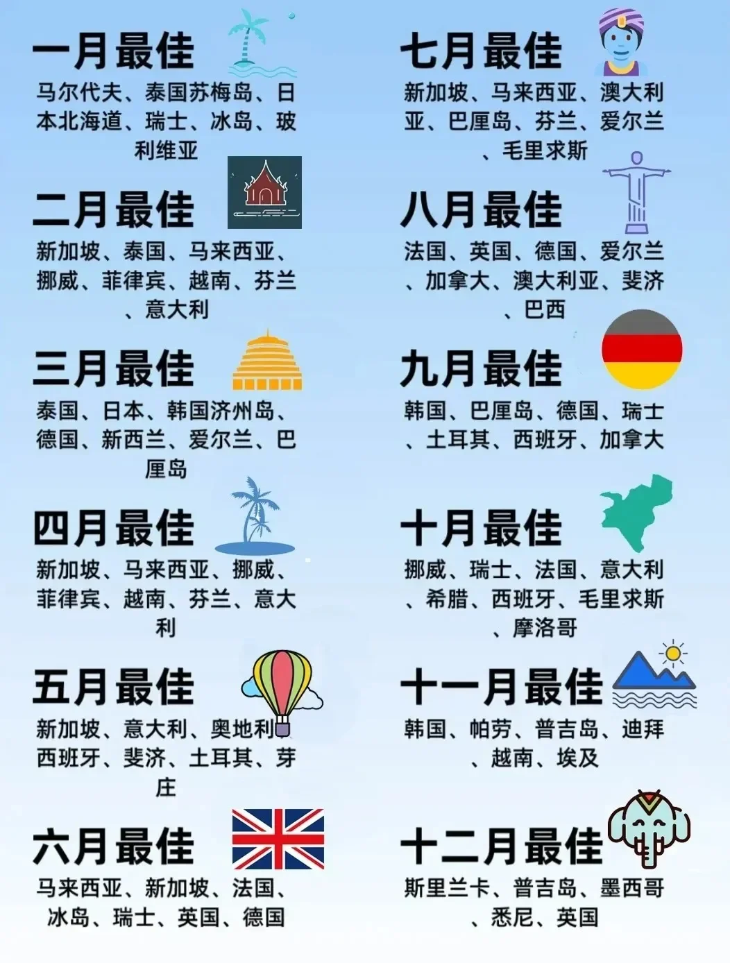 1月:马尔代夫、泰国苏梅岛、瑞士、冰岛、日本北海道;