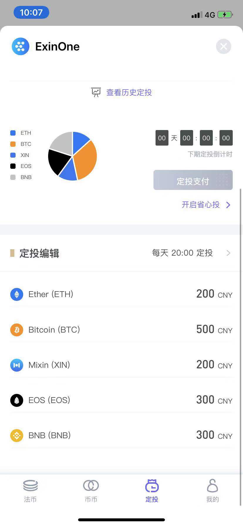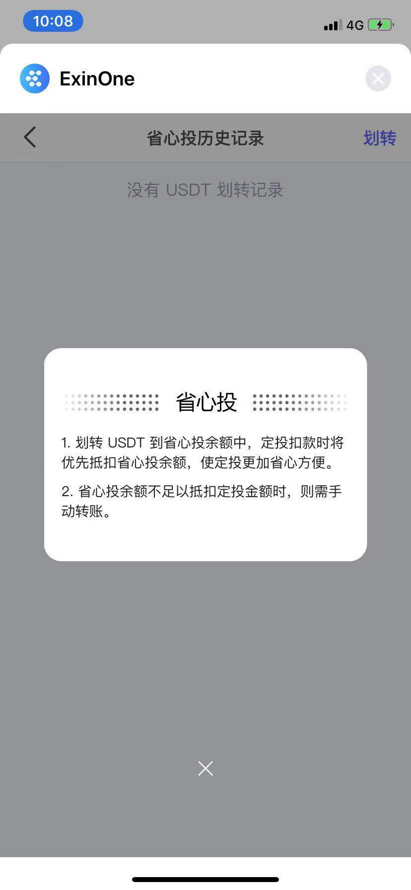 Exin 还有一个功能叫“省心投”,简而言之,就是你把USDT 提前存进去,设定好定投频率,然后就在存入的USDT 全部定投完之前就不用管了。