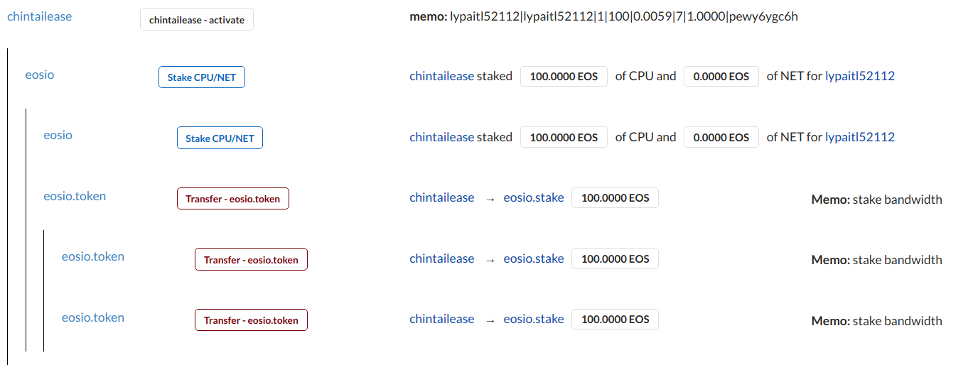 在Activate的步驟我們可以看到chintai這個合約做的事情:首先是Stake了100 EOS的CPU給該用戶(eosio.stake),接著再把我應得的利息轉到我的帳戶。