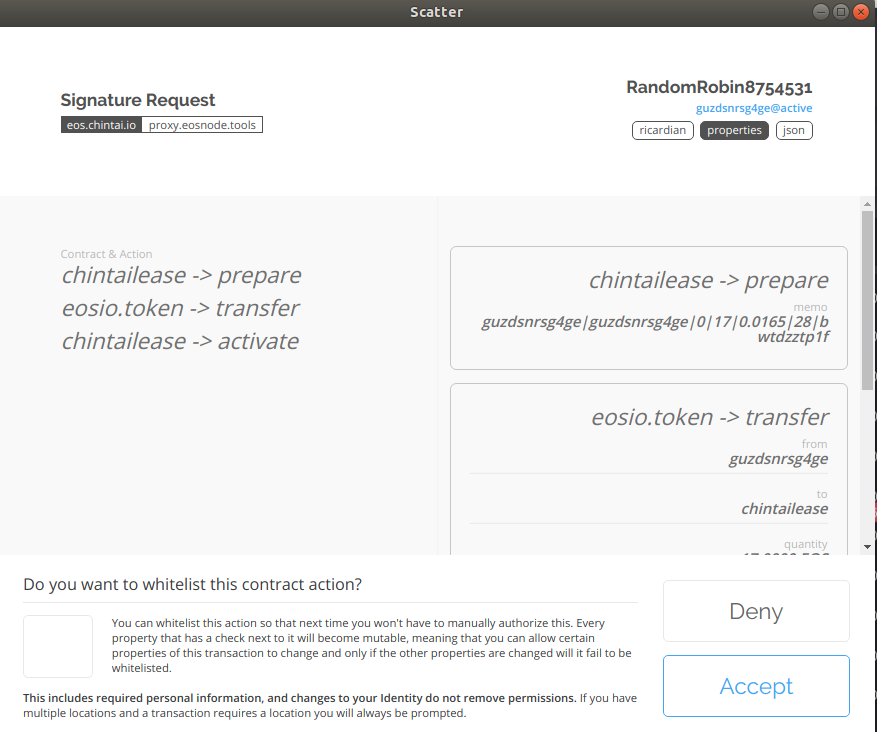 - 一樣在跳出的Scatter上選擇Accept。可以在這個頁面上看到這個交易其實一共包含了三個Action,分別是prepare, transfer eos, 以及activate。兒eos.transfer的對象是chintailease,也就是這個智能合約的位址。