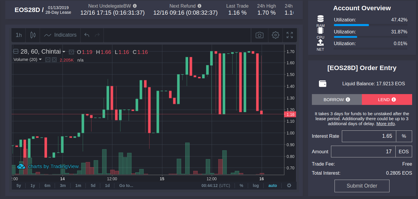 - 決定了時間長短之後就可以來下單了。我們要下的是「借出」EOS的單,所以要選擇Lend。Interest Rate那一欄選擇的就是「出租期間利息比例」,假如我們選擇28天的市場,那麼意思就是「這28天收多少利息」。輸入完之後會看到Total Interest自動計算完成,也就是要選擇租用這你的EOS頻寬的人,要立即付給你的EOS數量。確認無誤之後就可以按Submit Order了