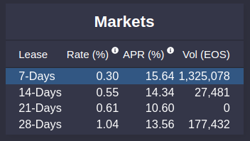 - 可以在左上角的Market選擇想要出租/借入EOS的時間,在這個平台上是依照租賃時間長短分成不同的市場