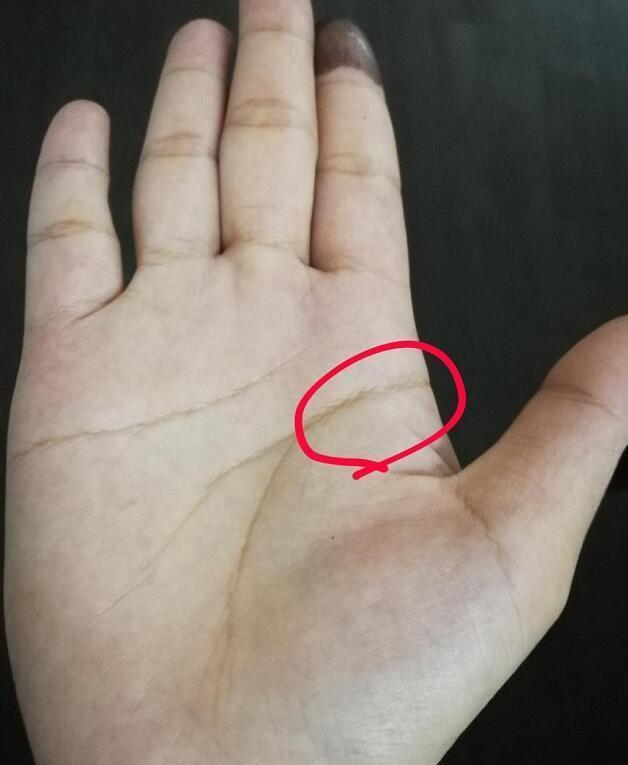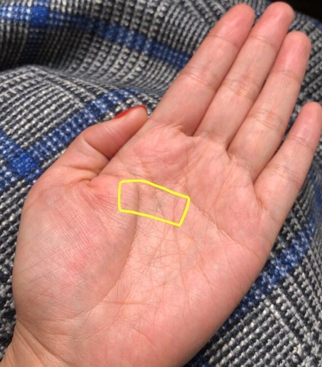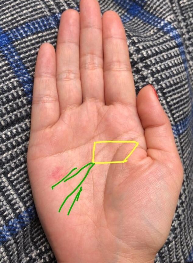 圖壹標記的三角紋啥意思。其實妳結合第二圖就明白了,是天紋尾部分叉了,偶然形成的三角紋,天紋尾部分叉說明多情,並且會因為感情問題而影響事業發展,還會因此破材。當然三角紋就是破材的標記。黃色豎紋是機遇紋,天紋尾部出現,人生後期機遇多,利事業材運