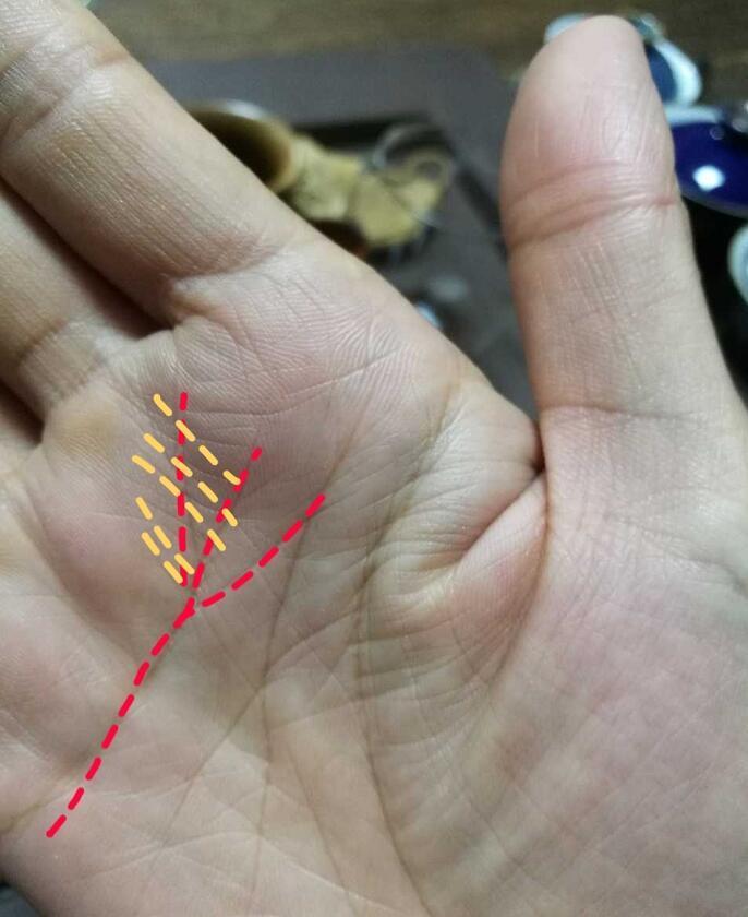 紅線是材線,有材線的,都可以有穩定的工資福利待遇。就是穩定的工作運。材運後半部清晰有力,說明後運好,三十歲前工作事業波動起伏大。黃線是天紋~也是副事業線,天紋沖克材宮也主初期有些波折阻礙。天紋尾部分叉交合人紋的,都是不善於處理感情問題的那類,並且會因為感情問題而影響事業發展。所以容易犯情傷