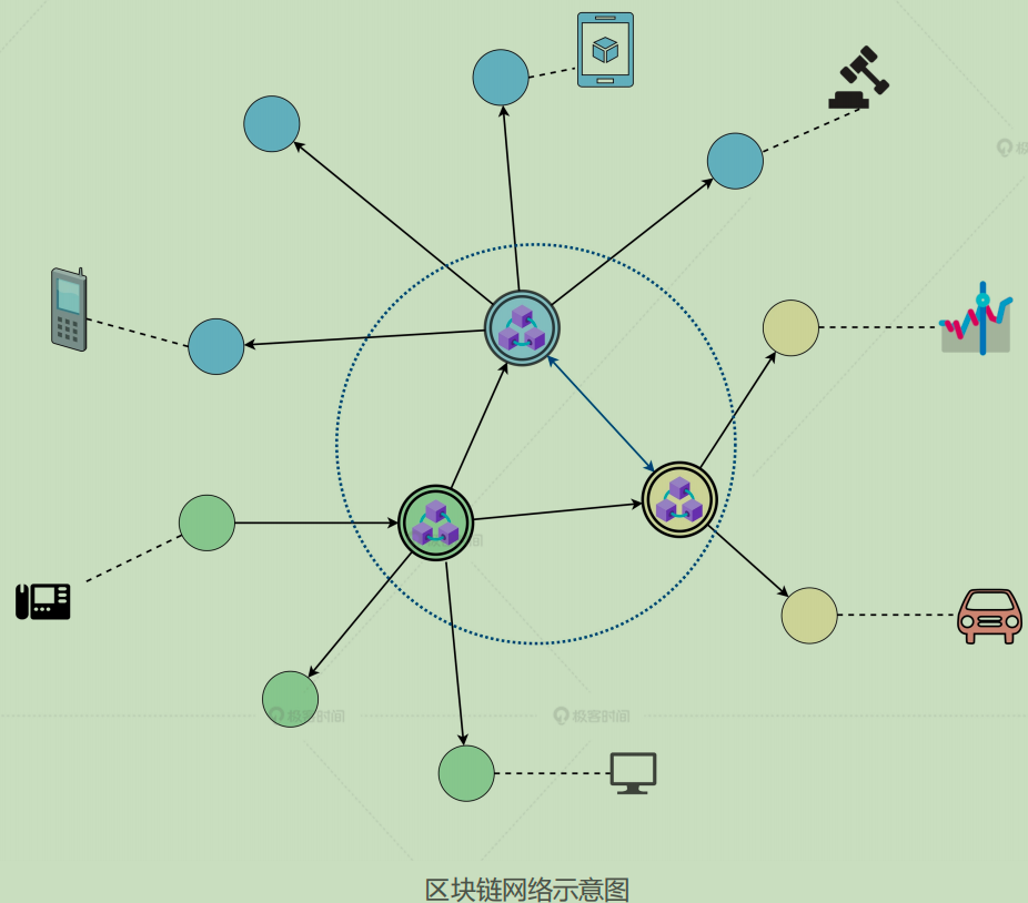 从区块链网络示意图中可以看到,在区块链网络外围有大量的手机、电脑、汽车等外联设备,这些设备与任意的区