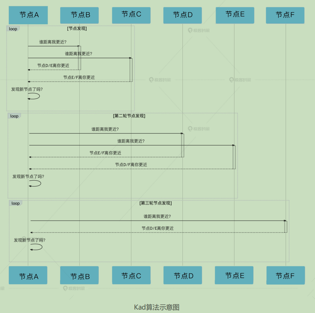 - 那么节点 A 最多可以得到 2 × 2 个新节点信息,随后再请求这 2×2 个新节点中距离节点 A 最近的 2 个节点。让它们再分别返回与节点 A 距离更近的 2 个节点,整个过程持续迭代,直到没有新节点被发现。(返回节点E,F,无新节点)