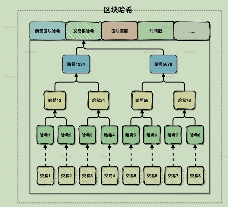 区块体中包含的交易所对应的交易哈希,可以作为默克尔树的叶子节点,然后依次往上进行哈希计算,最后得到的根哈希就是区块体所有交易的交易根哈希,这个数据将会记录在区块头中。