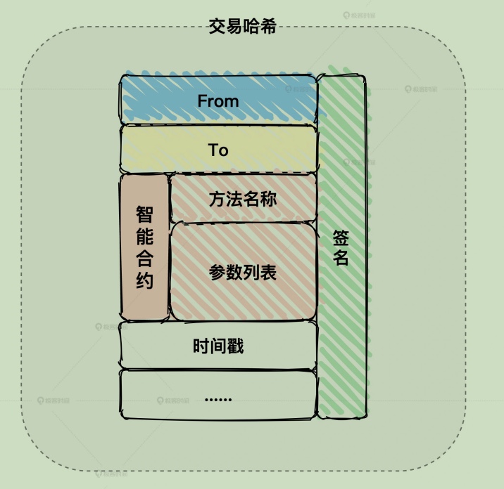 智能合约标识的是当前这笔交易要执行智能合约的名称,随后附带了执行智能合约对应的方法以及执行该方法时应该附带的参数列表,不同方法可能有着不同长度不同数据类型的参数,此处统一用参数列表表示。