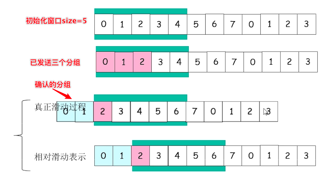 发送端上来了分组数据 -> 发送窗口滑动 -> 接收窗口滑动 -> 发送确认;确认后,重复发送流程。