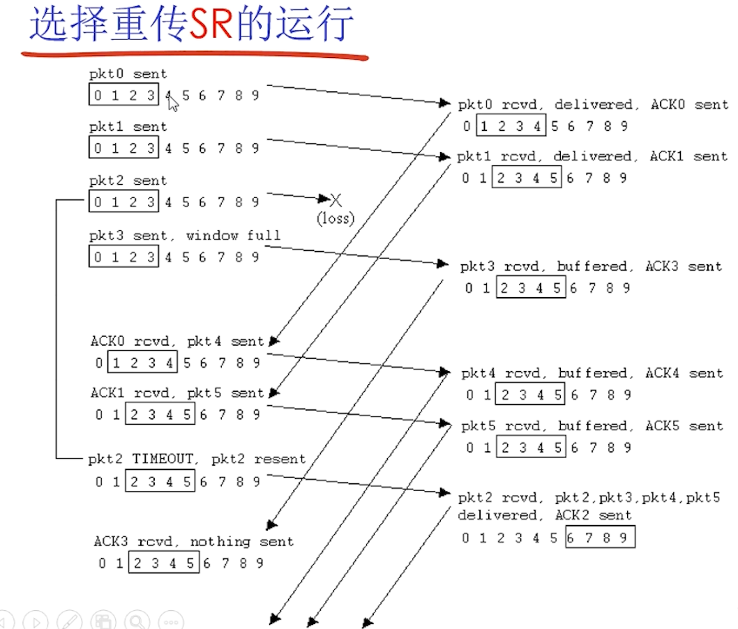 b. 接收窗口尺寸RW >1: 收到那个分组,发送那个分组的确认。(非累计确认)