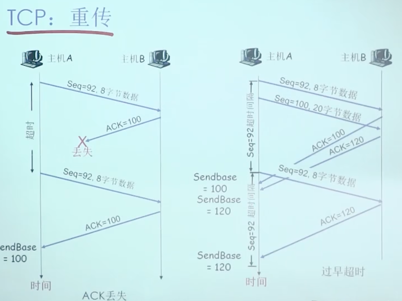 - 如果是对尚未确认的报文段确认(更新已被确认的报文序号,还有未被确认的报文段,重新启动定时器)