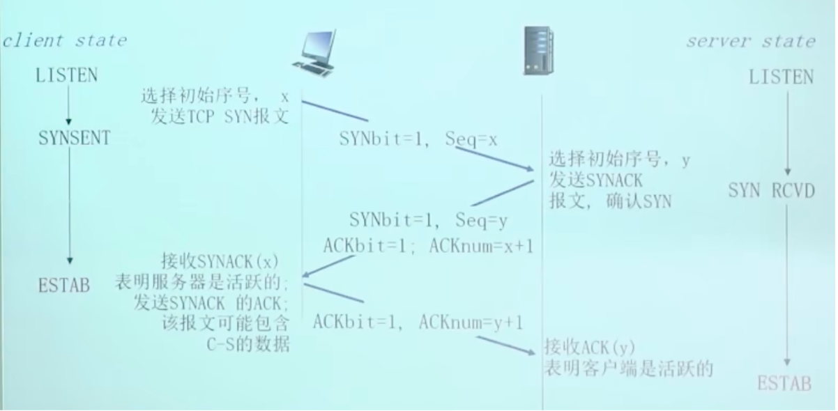 在正式交换数据之前,发送方和接收方握手建立通信关系。(同意建立连接,连接参数,控制变量同步)
