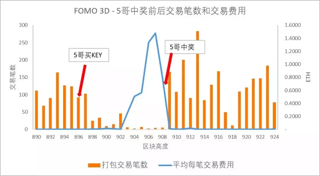 在分析过程中,我们也惊奇地发现,5哥购买KEY直至中奖的这3分钟、12个区块里的交易笔数异常的低,几乎为平时的1/10不到,而交易费用却数百倍高于平时水平。