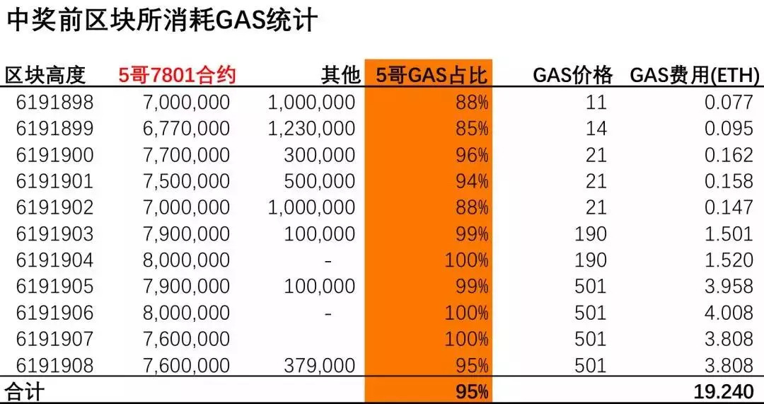 3、接着我们统计了在中奖前的12个区块里的GAS消耗。