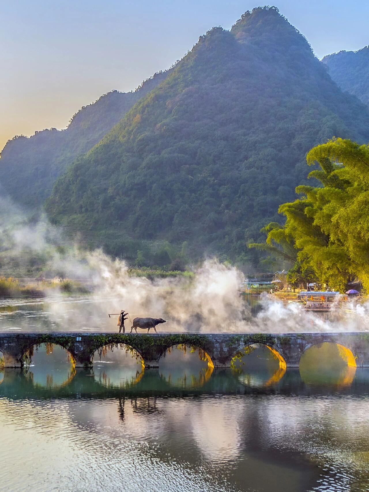 这里是德天跨国瀑布的源头,夕阳落下时,光线照射在十五孔桥上,桥底会形成“金光穿洞”奇观,拍照绝了!