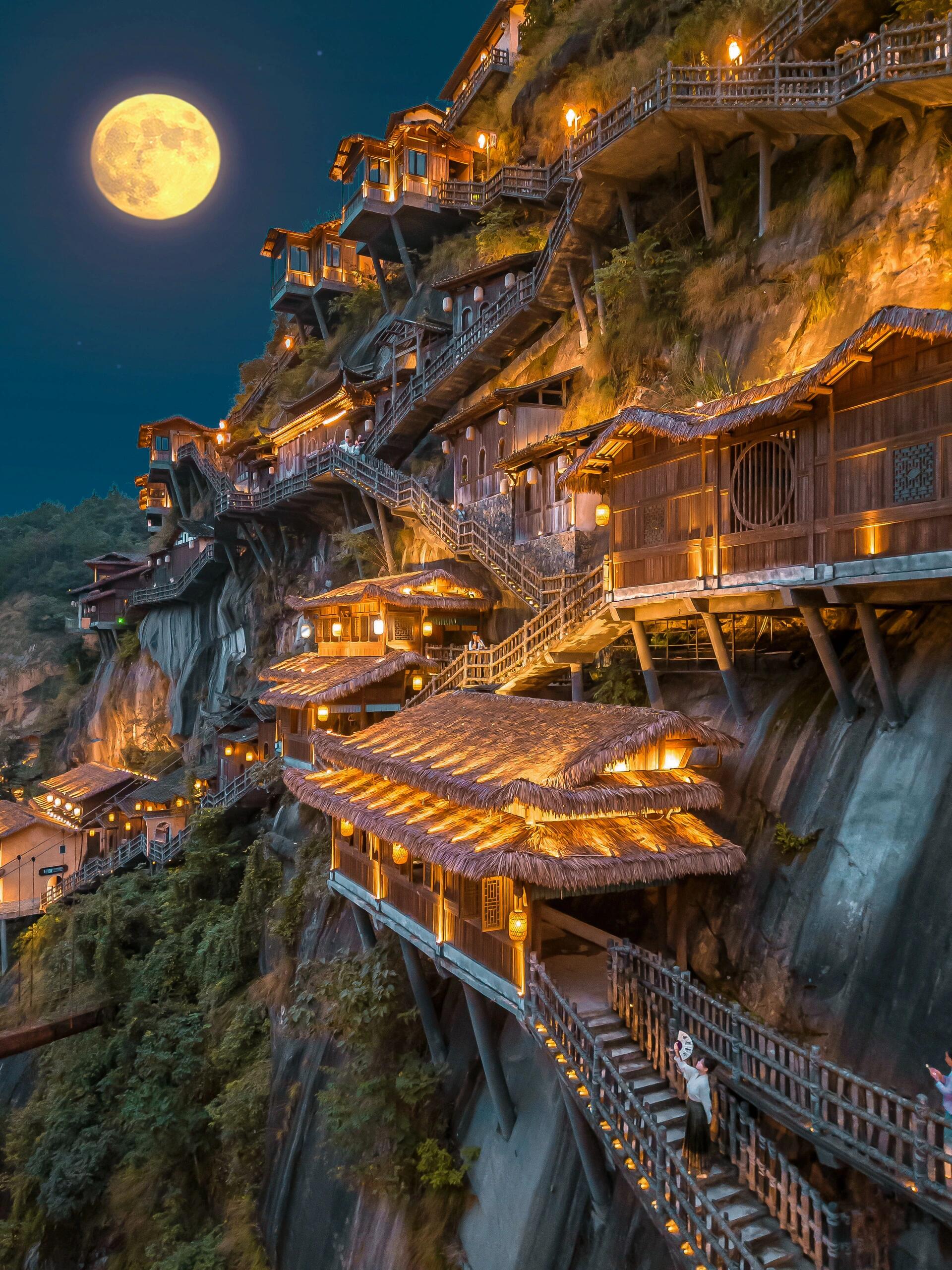 无人机视角可以看到整个建在崖壁上的栈道和民宿,蓝调时最美。