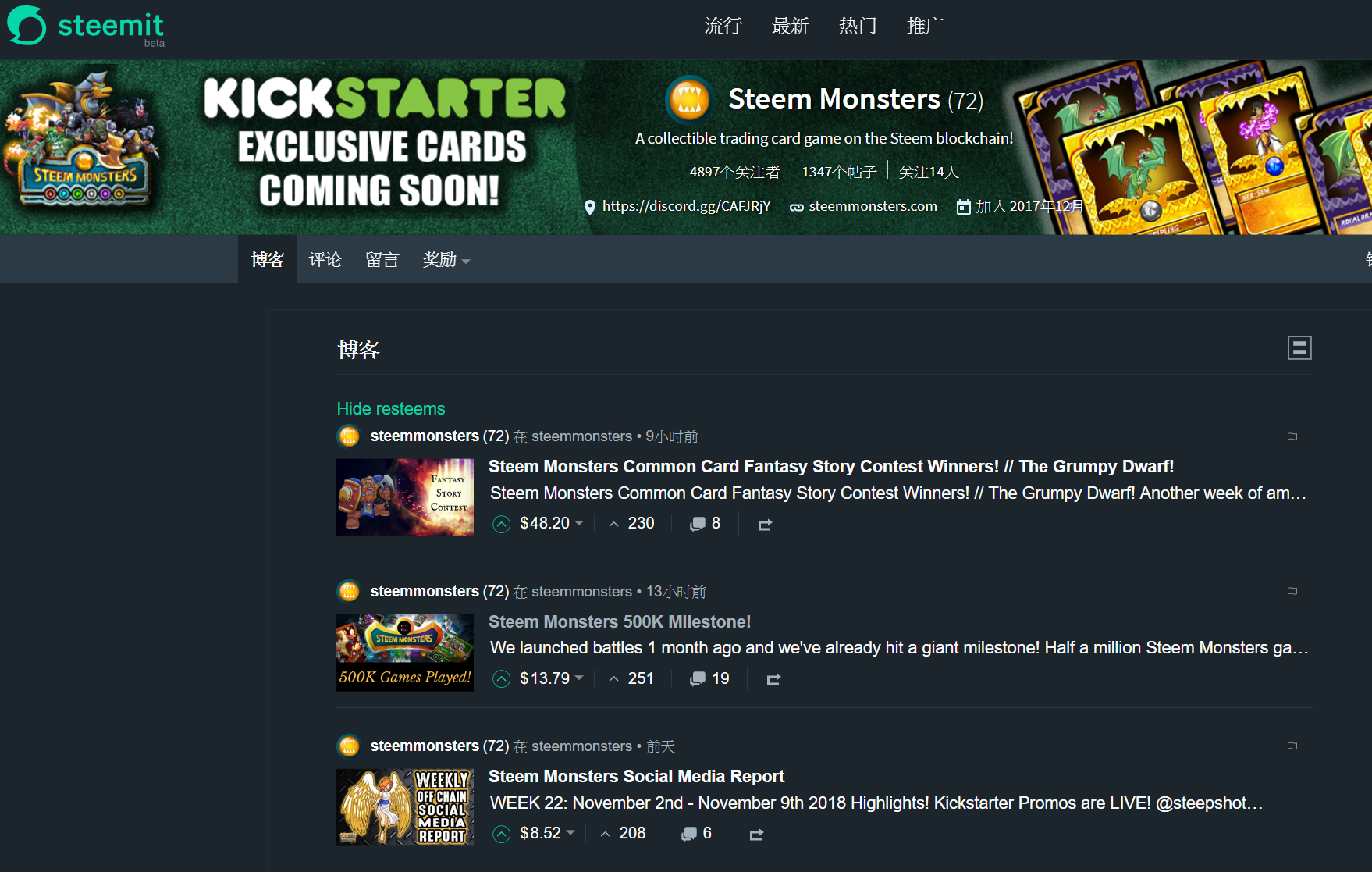 另外有一樣好的就是,卡片是有價值的。是可以用Steem幣來進行交易的,也就是說他朝你想退坑,也是可以把卡片放在二手市場拍賣,賣掉卡片的。