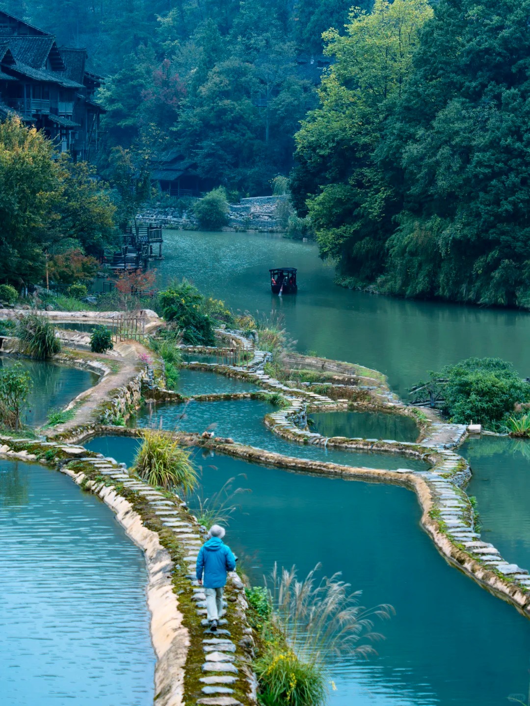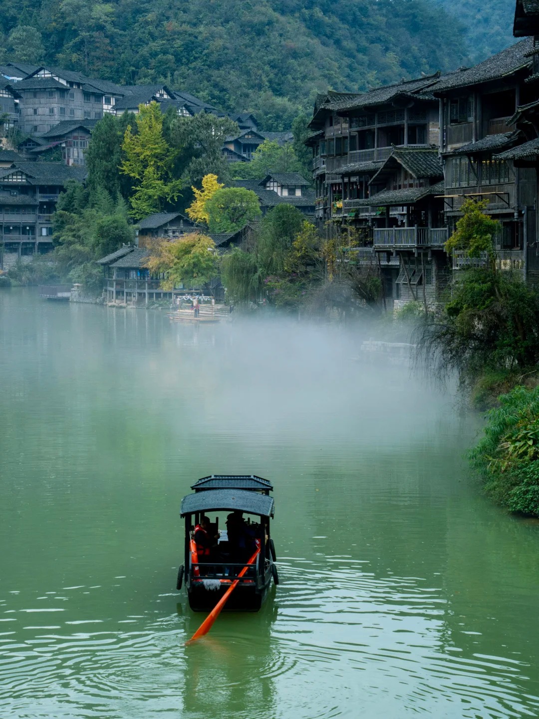 走进乌江寨,最让人惊艳的,莫过于 碧绿如玉的乌江水。两岸的吊脚楼倒映在江面上,静谧得宛如水墨画。在这里,你可以乘坐摇橹船沿岸欣赏,山水交融之间,仿佛时间都慢了下来。无论是冬日清晨的薄雾,还是傍晚的夕阳,都让人舍不得移开目光。