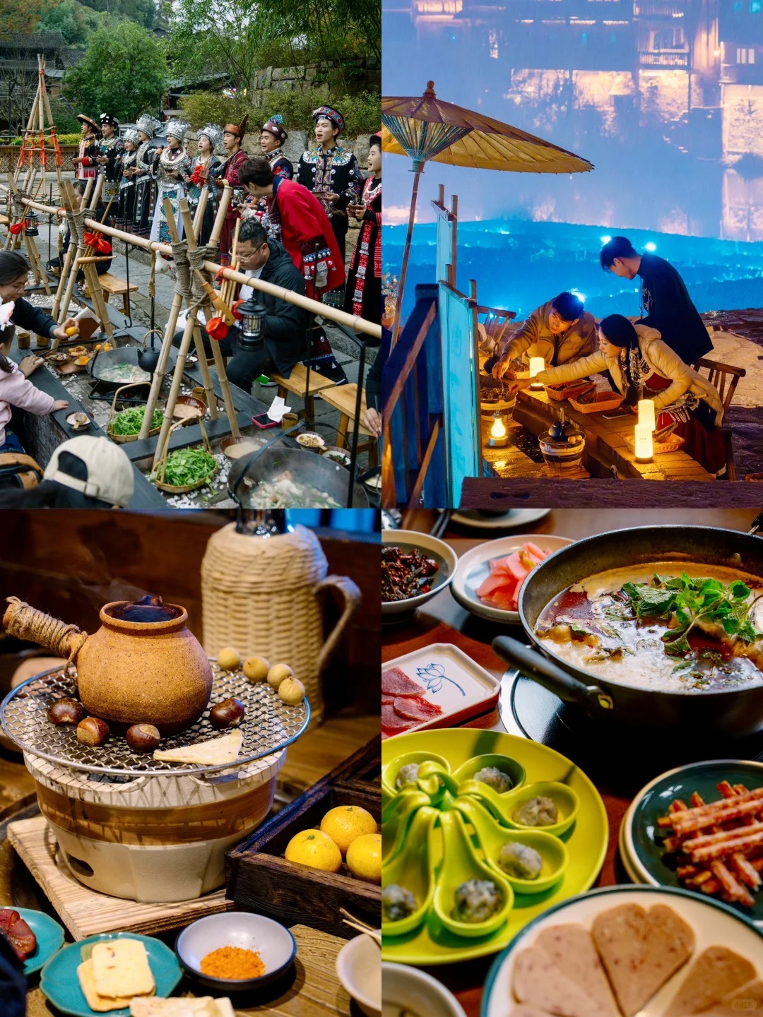 🍲 吊锅宴:以特色羊肉为主的吊锅宴,不仅能品尝到贵州的地道风味,还能边吃边看表演(地点:廻龙岛古戏台前)。
