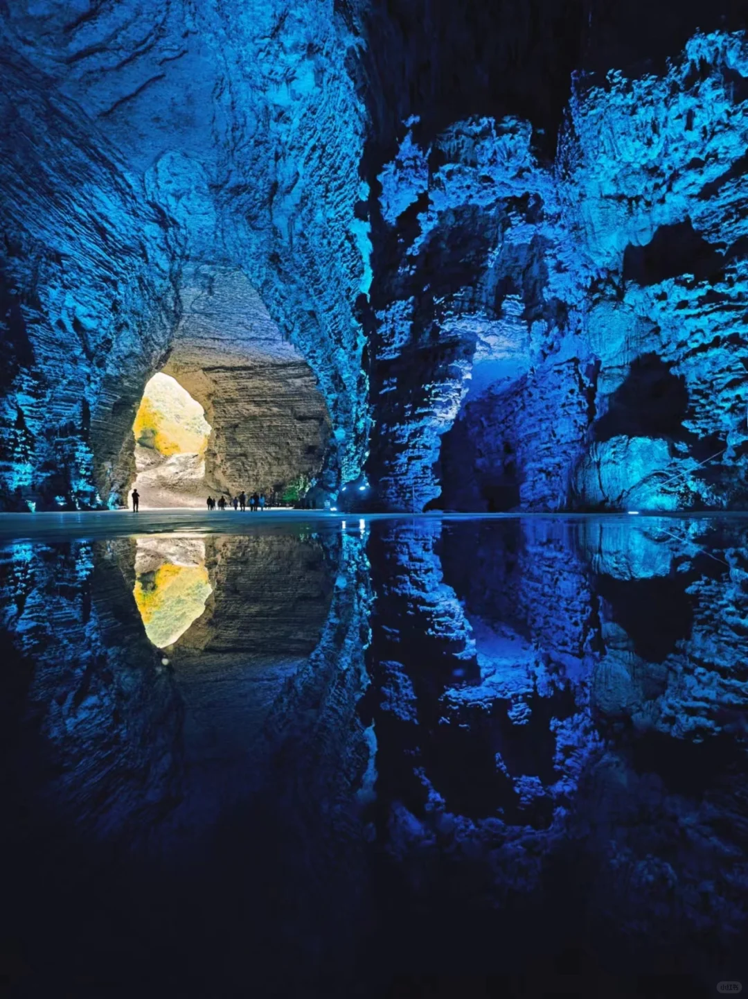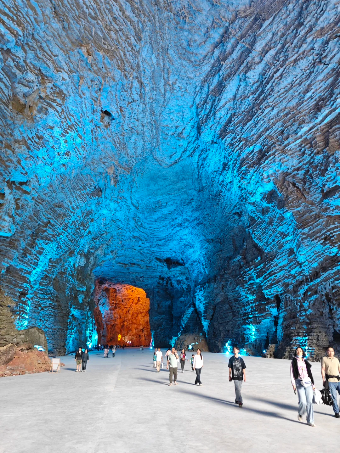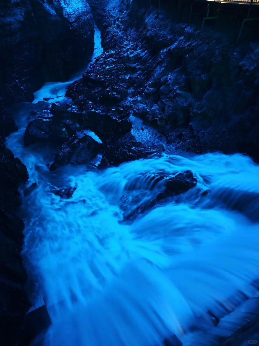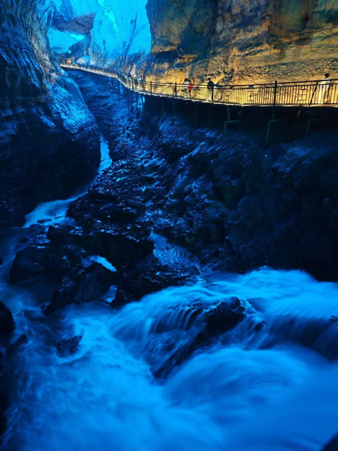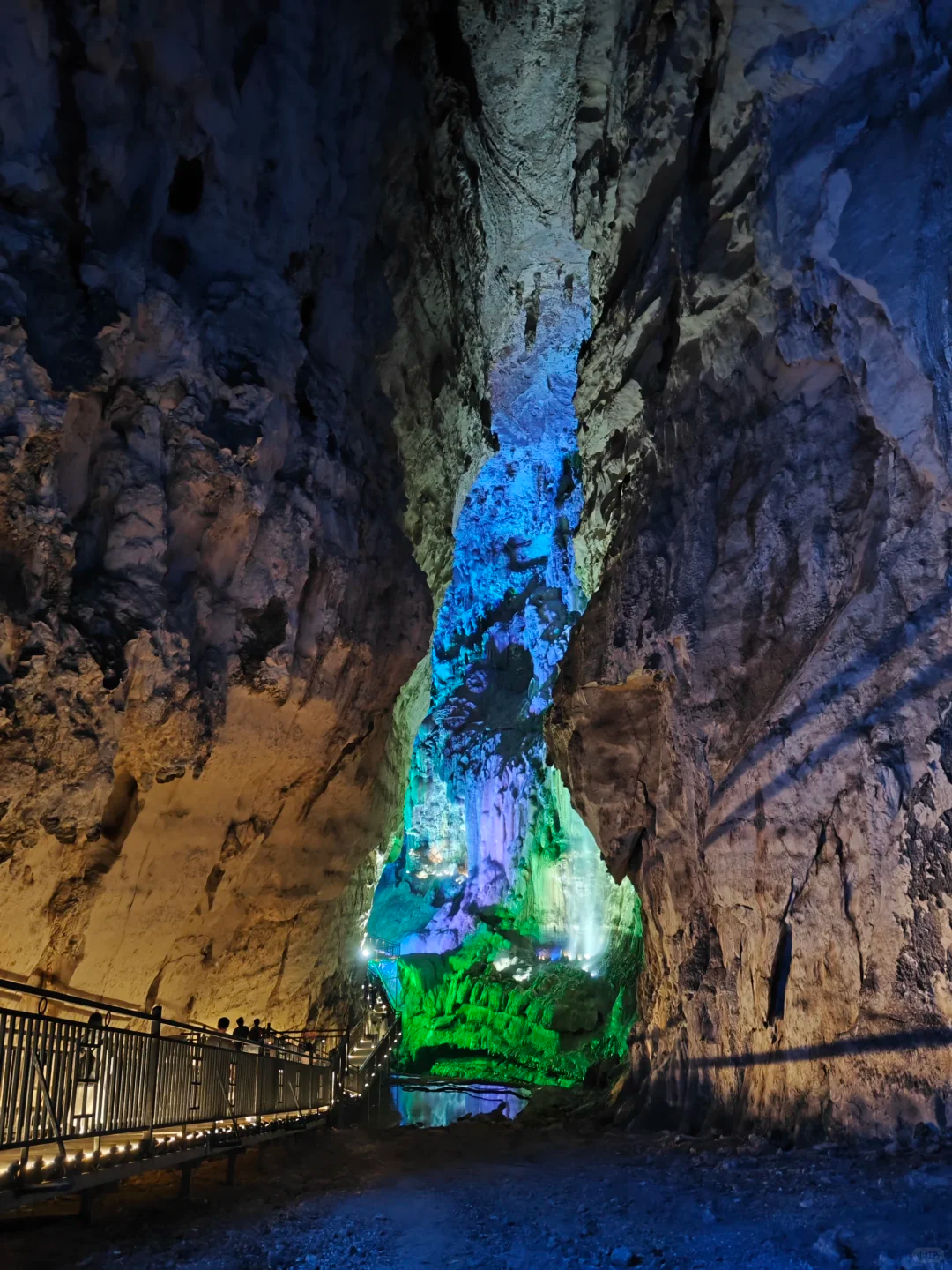 被灯光照亮的钟乳石像极了盗墓笔记中的场景,长长的栈道又像是一步一步带你走入地心。溶洞内不仅有美轮美奂的钟乳石景观,还可以看到落差有五六层楼高的瀑布,偶尔还能听到非常湍急的水流声,地下河水流量大的地方,声音响彻整个溶洞。这一路哇哇哇个不停,没想到从个小小的洞口进来,里面竟然真的别有洞天,果然配得上洞天盛境的响亮名号。这副景象,竟也十分契合桃花源记里描述的:初极狭,才通人,复行数十步,豁然开朗。