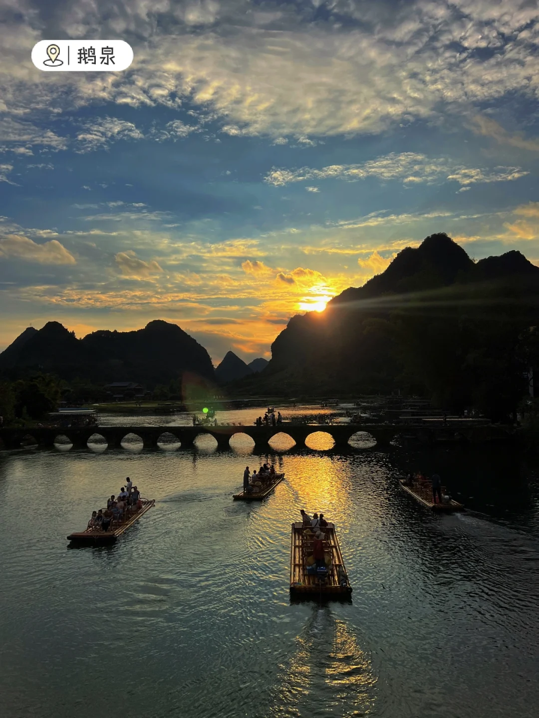 德天跨国瀑布的源头,夕阳落下时,光线照射在十五孔桥上,桥底会形成“金光穿洞”奇观