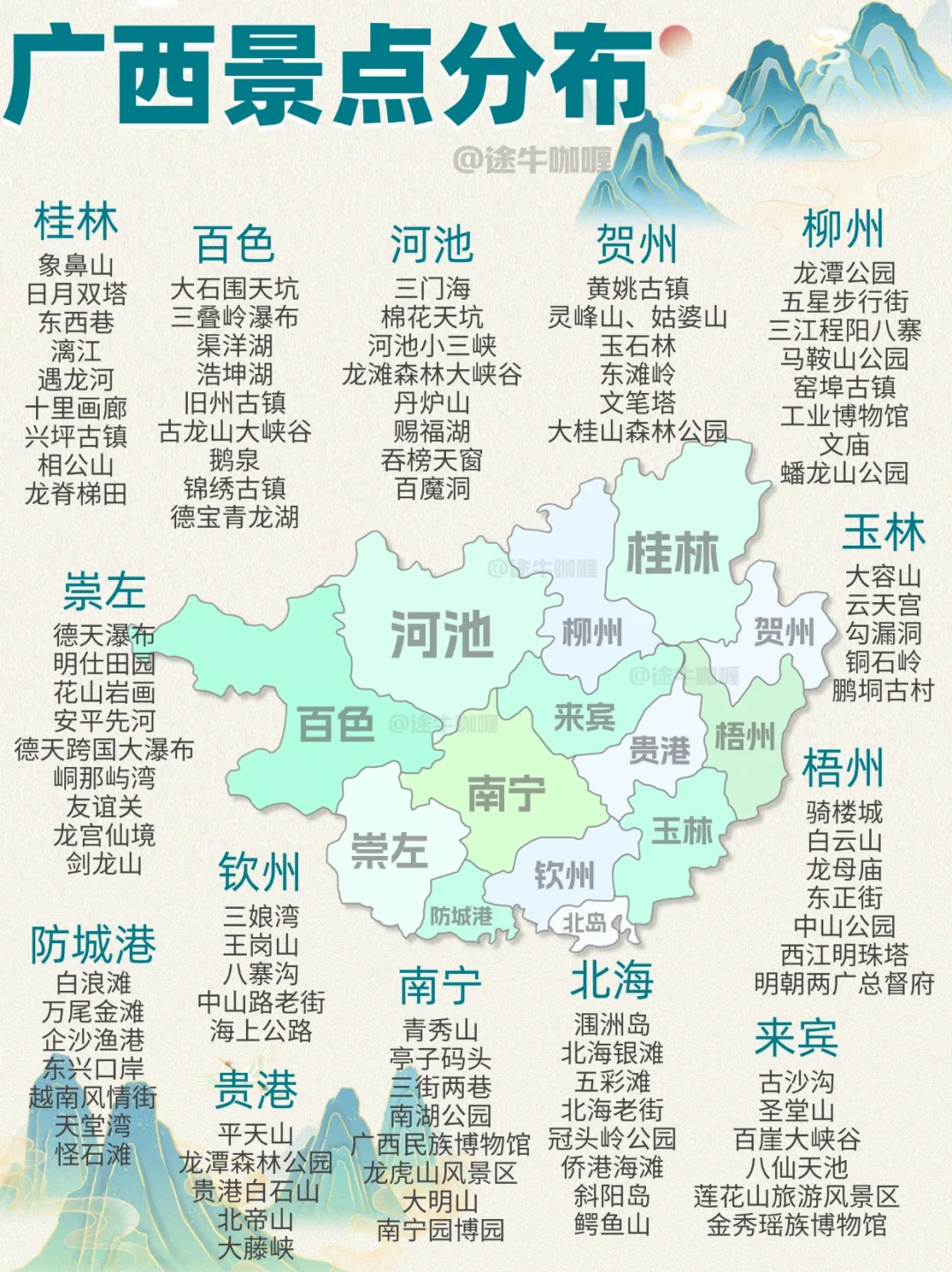 青秀山、亭子码头、三街两巷、南湖公园、广西民族博物馆、龙虎山风景区、大明山、南宁园博园