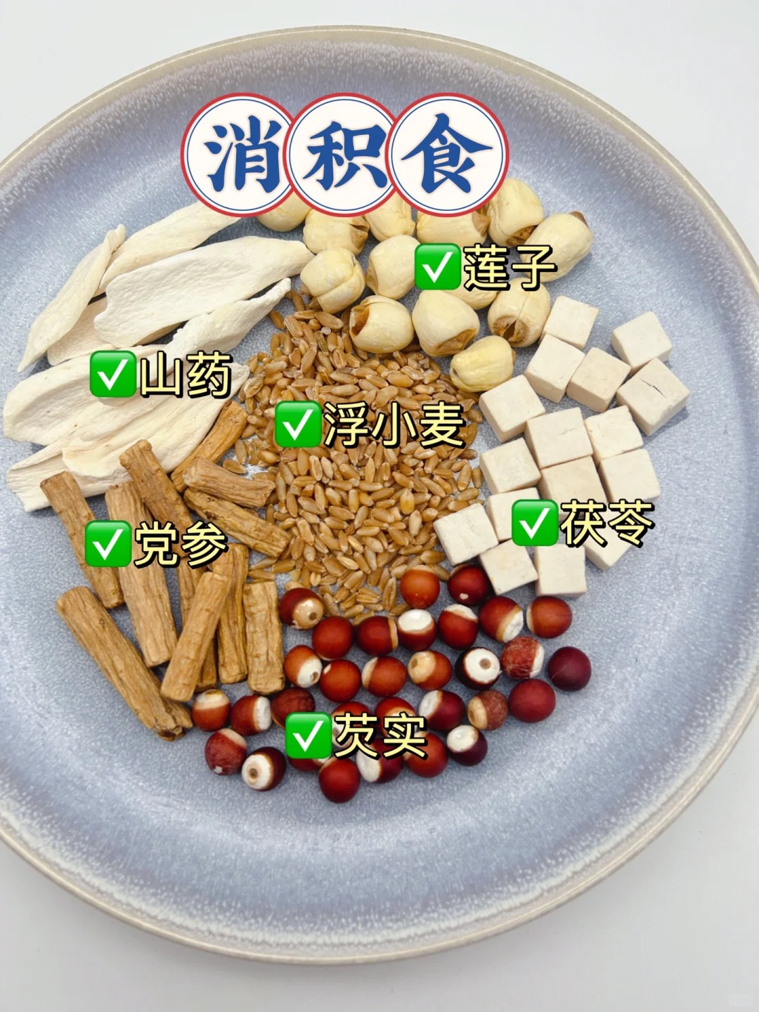食材:山藥、黨參、芡實、茯苓、蓮子、浮小麥